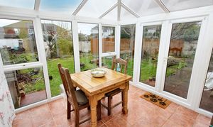 uPVC window to front. uPVC French doors to conservatory. Original solid wood parquet flooring. Clear view log burner.