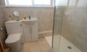 Dimensions: 7' 5'' x 6' 2'' (2.26m x 1.88m). UPVC opaque window to rear. Wash hand basin with mixer tap. Low level WC. Ceramic floor tiles. Walk-in shower enclosure with mixer shower. 2015 replacement suite. Ceramic wall tiles. Vertical radiator.
