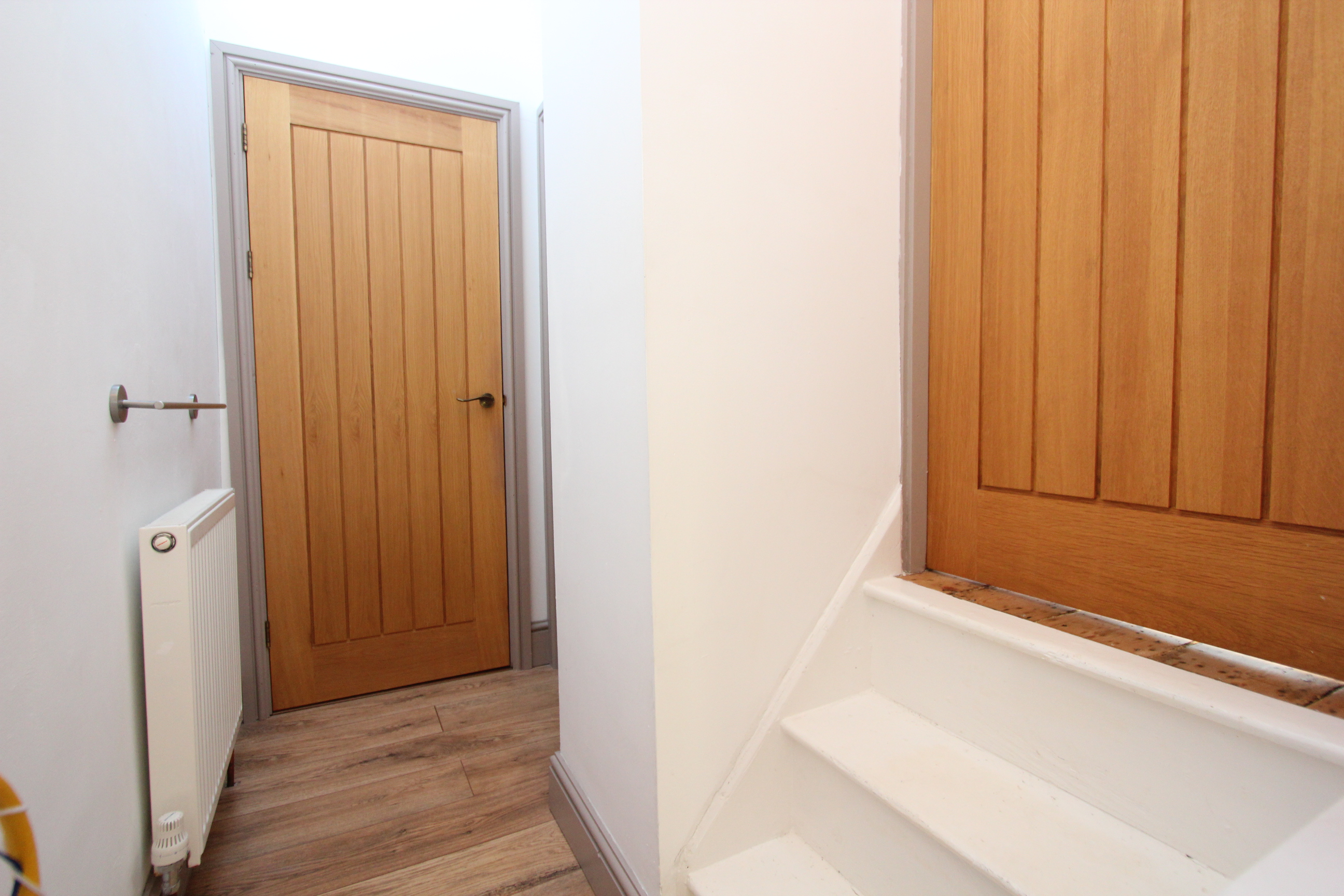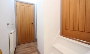 Solid oak door to bathroom. Solid oak opaque glazed stable door to rear.