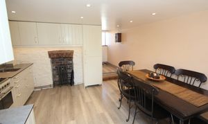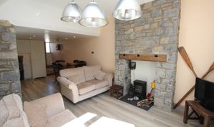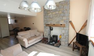Radiator. UPVC window to front. Wood effect flooring. Fireplace (currently blocked off). Open to kitchen/diner. Under stairs cupboard. Industrial lighting.