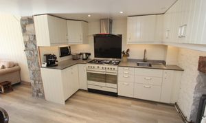 Period radiator. Wood effect flooring. Down lighting. Smeg 5 burner gas cooker with hood. Inset stainless steel sink with mixer tap. Microwave. Built in fridge freezer. Opening to rear porch.
