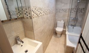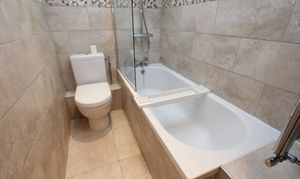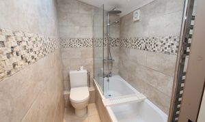 Ceramic sink with mixer tap. Ceramic floor tiles. Low level WC. Panelled bath with mixer shower. Down lighting. Velux to rear. Vertical radiator. Ceramic wall tiles. Airing cupboard with wall mounted Vaillant combination boiler providing the central heating. Washing machine.