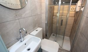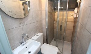 Ceramic wall tiles and floor tiles. Low level WC. Ceramic wash hand basin with mixer tap. Shower enclosed with electric mixer shower.