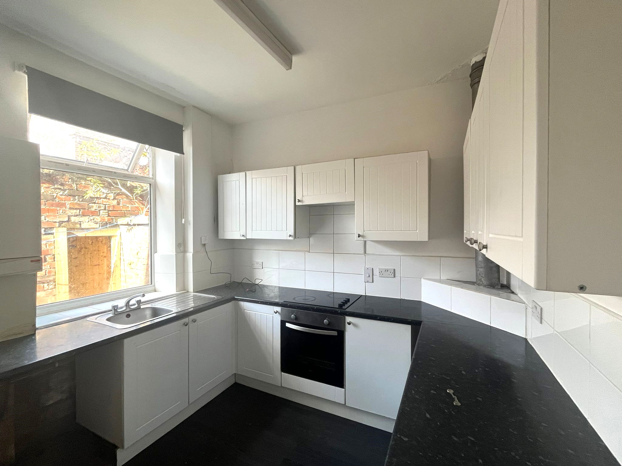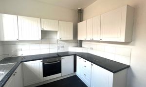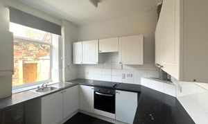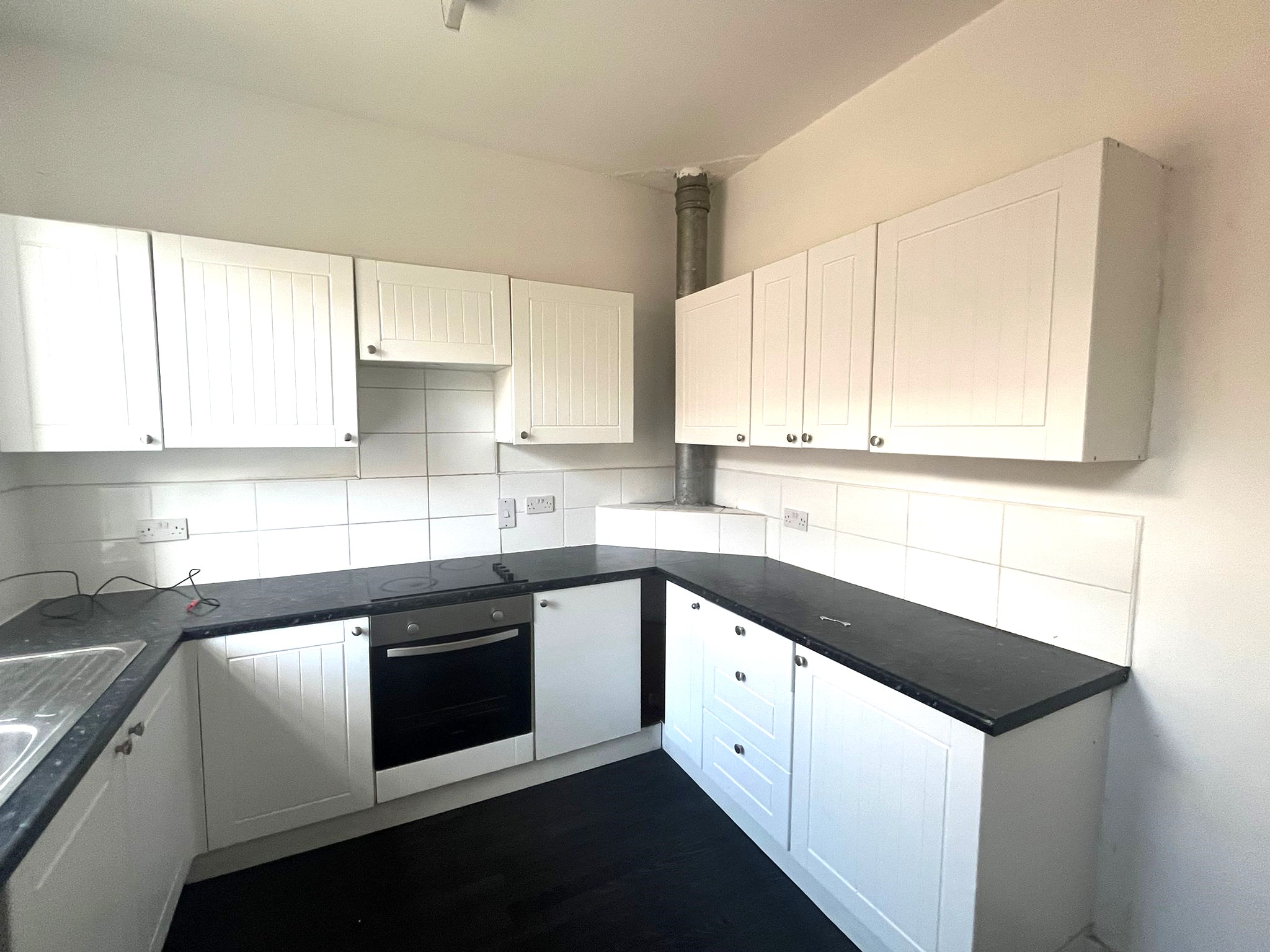 A good size kitchen with a range of white wall and base units with space for appliances. Oven and hob included.