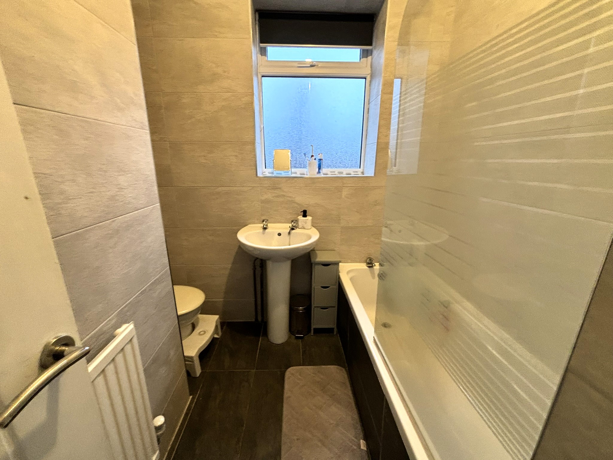 A modern tiled bathroom with sink, w.c. and bath with over bath shower.