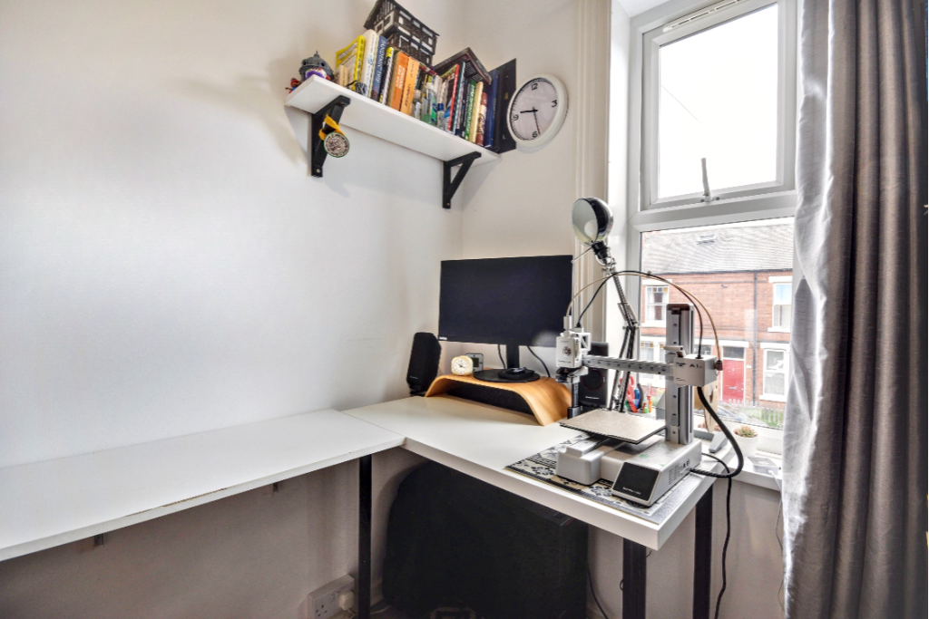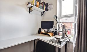 Front-facing single bedroom, ideal as a home office, with laminate flooring and neutral decor.