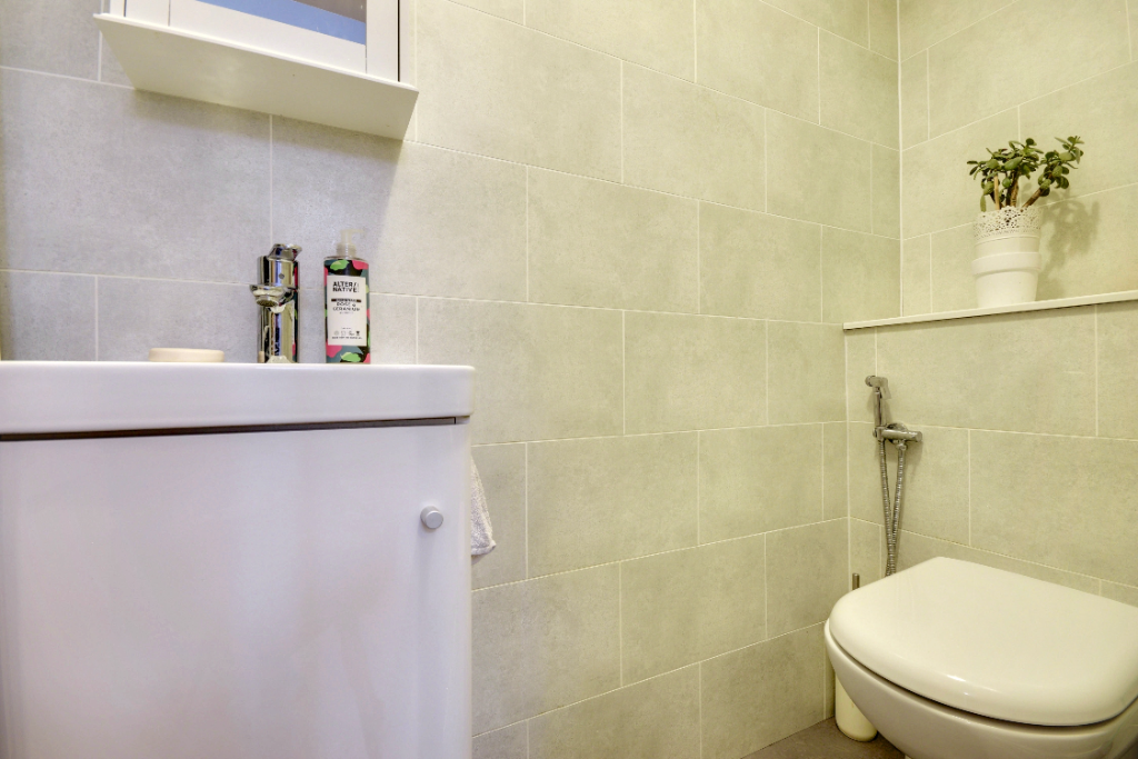 Modern and stylish with a wall-mounted toilet, a slimline sink with storage, fully tiled walls, and laminate flooring.