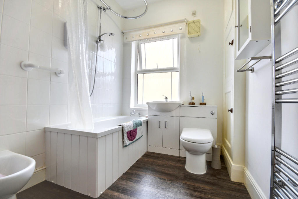 The contemporary family bathroom is equipped with a bath, an overhead shower, a vanity sink, a toilet, a bidet, built-in storage solutions, a heated towel rail, and laminate flooring, making it both practical and stylish.