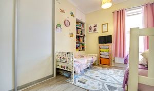 Currently oriented as a children's twin room, this rear-facing double bedroom features newly installed built-in wardrobes and views over the private garden.