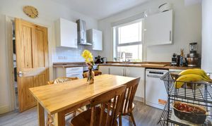 At the rear of the property, the kitchen/diner is fitted with contemporary off-white units and walnut-effect laminate worktops. The kitchen includes an electric hob, oven, stainless steel sink, and ample room for a large fridge-freezer. The large UPVC window overlooks the rear garden, allowing ample daylight to enter this spacious area.