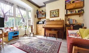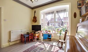 A large living room with a bright and airy feel, thanks to the expansive bay window. The property's laminate flooring continues into this room, which is further enhanced by high ceilings, stylish coving, and all finished in a pleasing neutral decor.