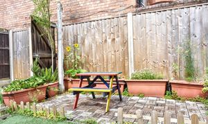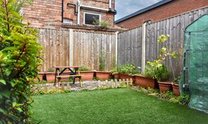 This low-maintenance garden features an artificial turf lawn, a decking area, a small patio, and established shrubs. Newly fitted fencing make this the perfect spot for a summer barbeque or a breath of fresh air when working from home.