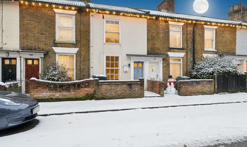 Upstairs, the front-facing bedroom is a generous double, benefitting from a built-in storage cupboard and a Velux-style window that floods the room with natural light. The second bedroom enjoys a bright and airy feel with its double-aspect windows. The family bathroom completes the first floor, featuring a bath with a shower over.