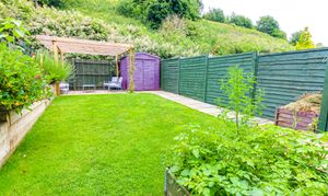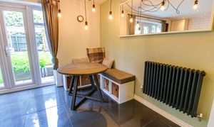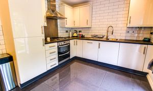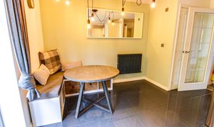 Rear facing upvc double glazed window and french doors, fitted range of base and wall units, electricaloven, four ring hob, integral fridge, freezer, washing machine and dishwasher. Tiled flooring, storage cupboard and anthracite radiator.