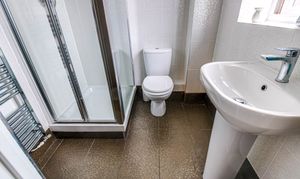 Front facing upvc double glazed window, cubicle shower, WC, pedestal wash basin, tiled walls and flooring. Heated towel rail.