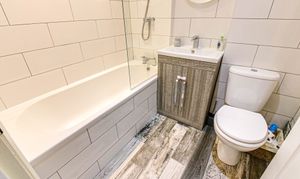 Modern bathroom suite comprising of vanity sink unit, WC, tiled panel bath, over bath shower, tiled wall and flooring.