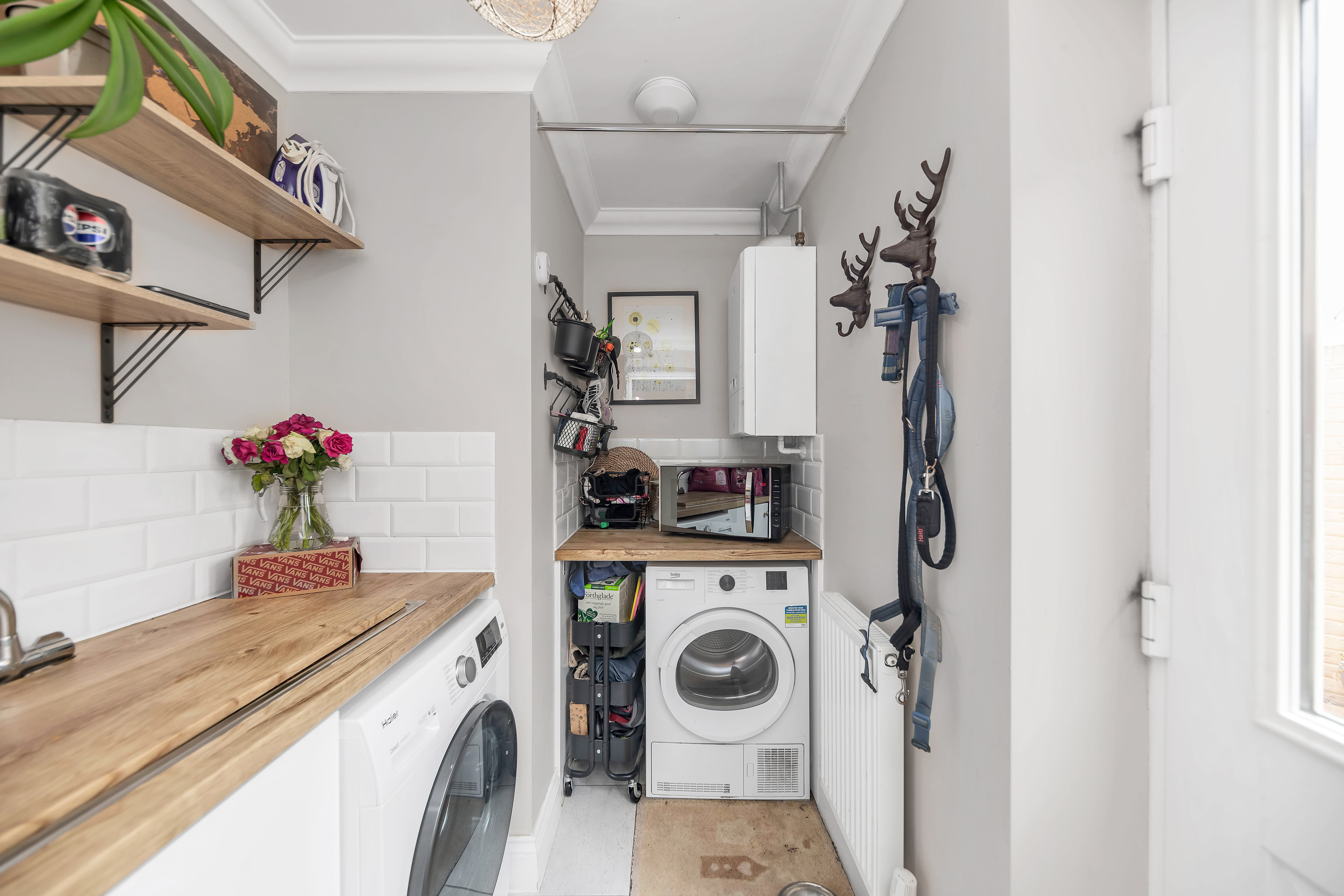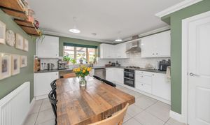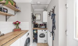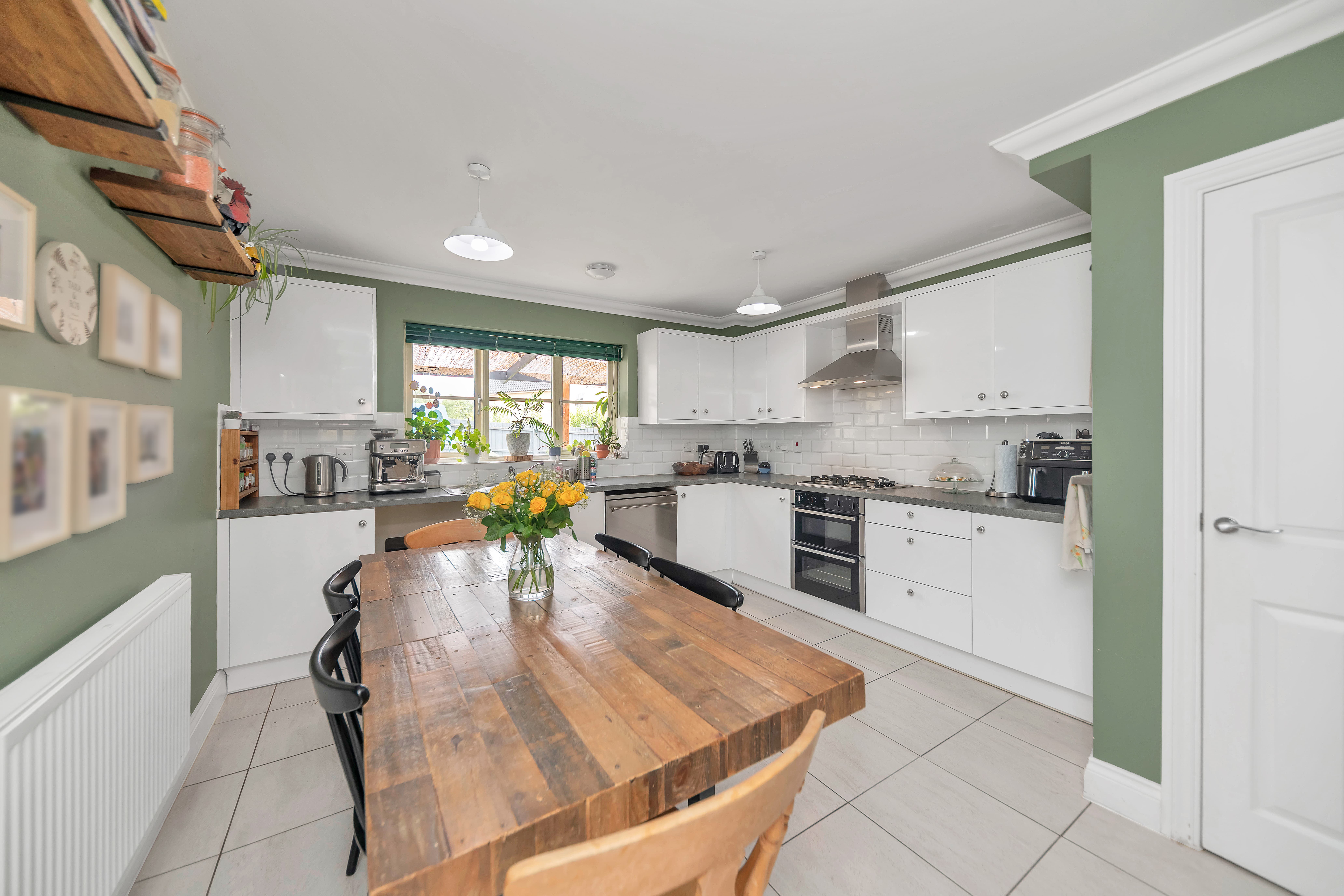 The kitchen/breakfast room is a very good size, featuring a large window to a garden aspect, a range of modern base and wall units, laminate worktops, tiled flooring and splashbacks, pendant lighting, an integrated double oven, gas hob and extractor hood, and space for a breakfast setting and other small kitchen appliances. The utility room provides further storage, access to the side of the house, and space for large laundry appliances.