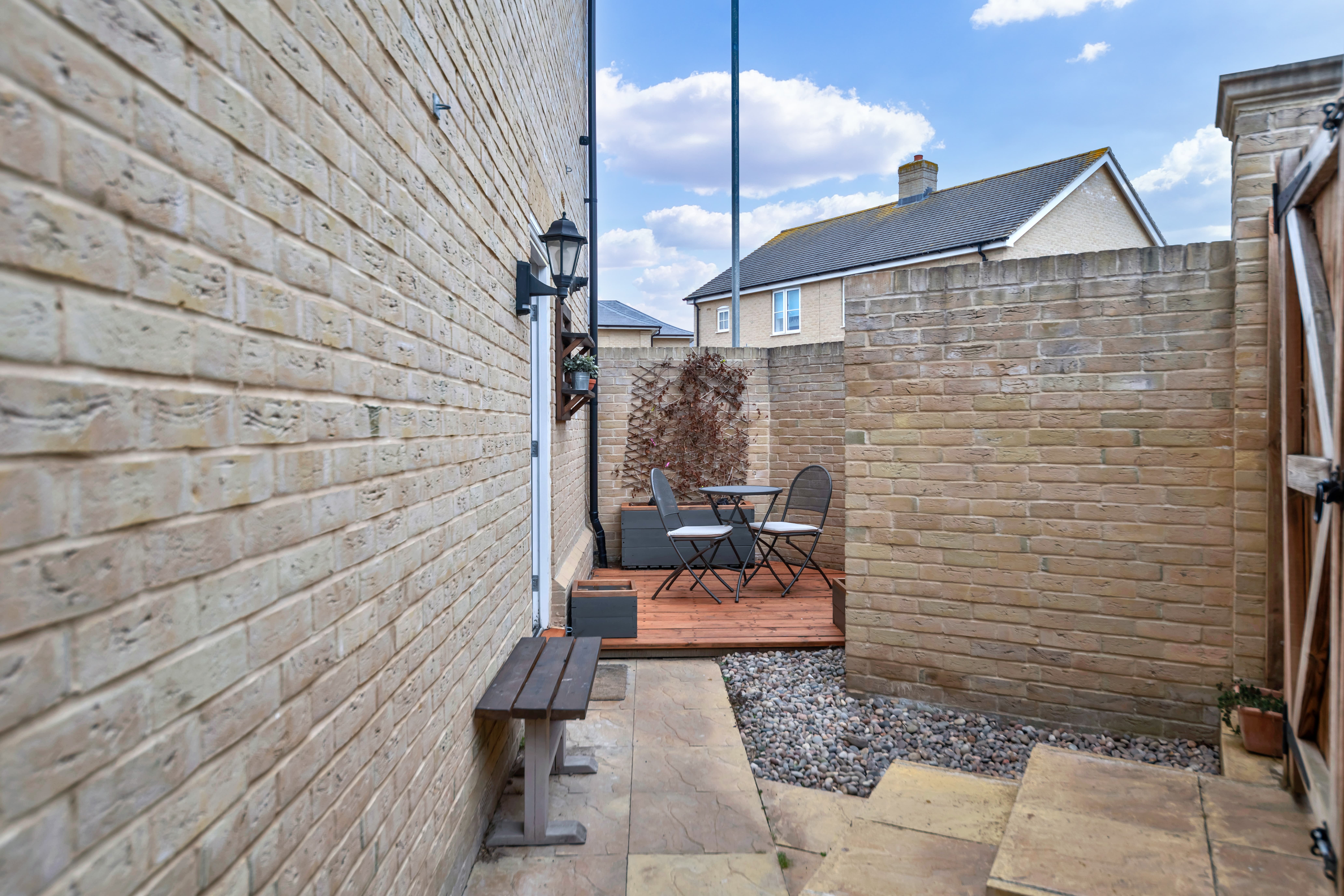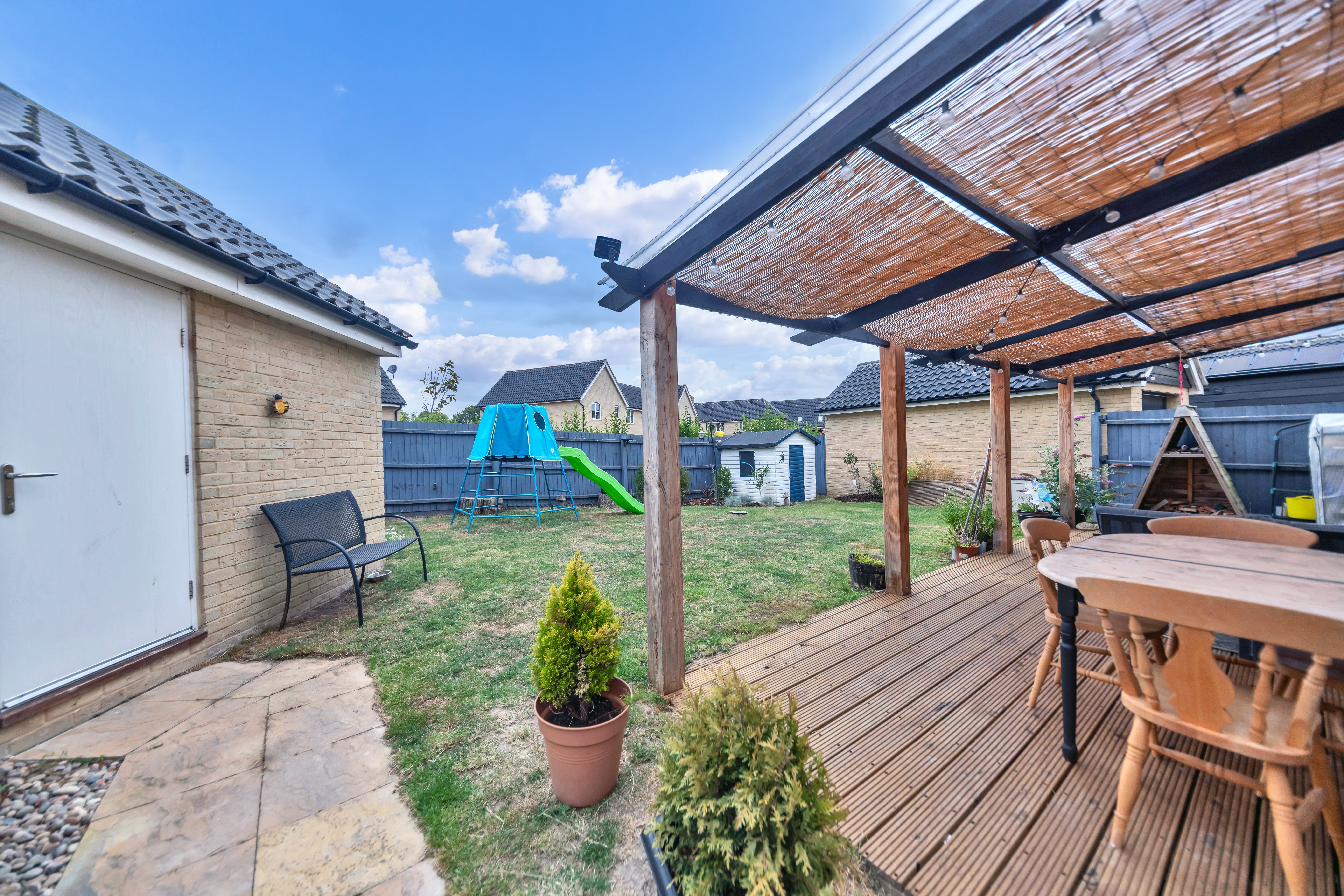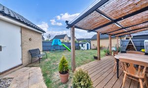 Outside, to the rear, the garden is a good size, fully enclosed by fencing and offering a lovely space to sit and relax after a busy day. It is laid mainly to lawn, with a covered deck and pergola, providing space for garden furniture, enjoying family meals, and entertaining guests. There are raised planters with flowers and shrubs, beds of decorative stones, plenty of space for pots, gated access to the side of the house, access to a shed and to the garage, and plenty of scope for future owners to put their own stamp on things.