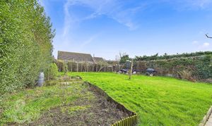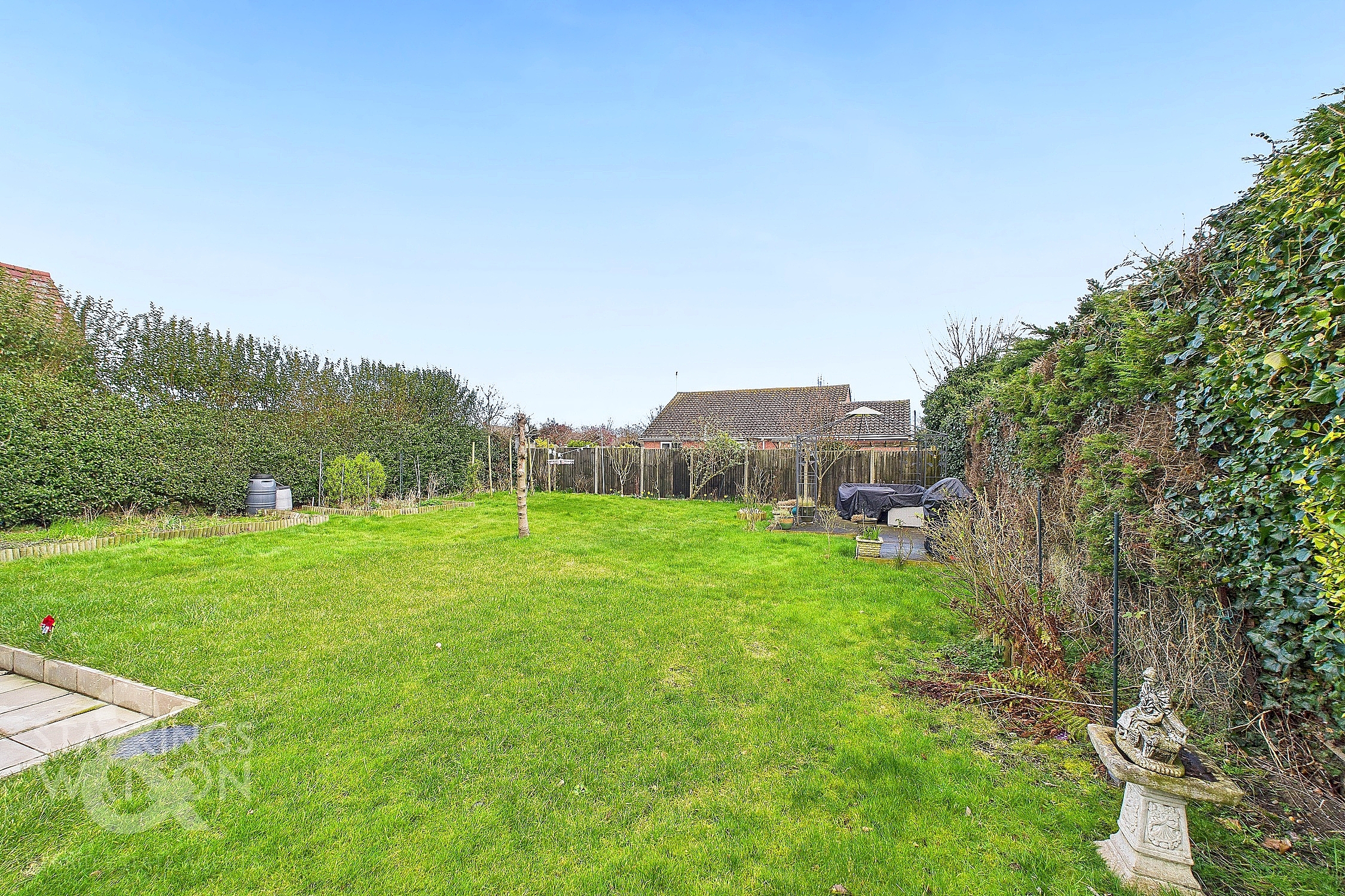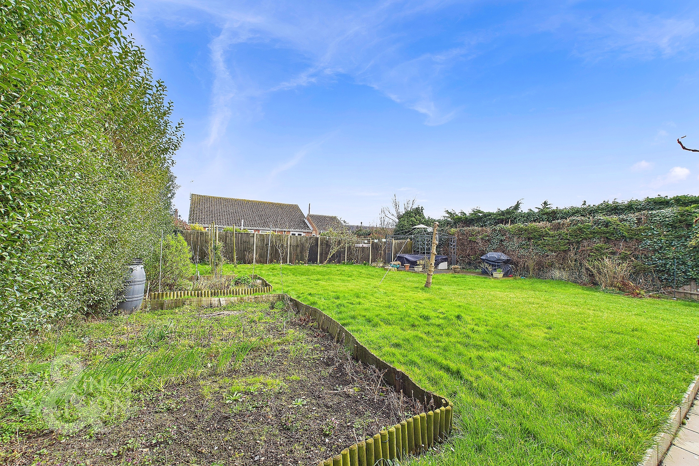 THE GREAT OUTDOORS The rear garden offers plentiful space, mostly laid to lawn, with tall mature hedging to either side of the property providing total privacy. A herb garden/vegetable patch occupies one side of the garden with a raised concrete seating area at the other.