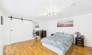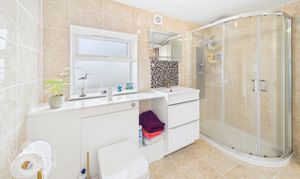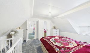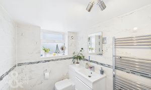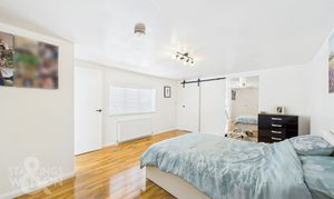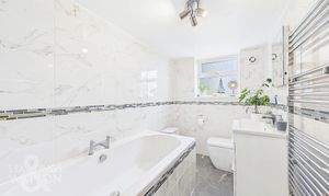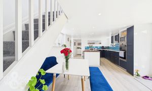 On the opposite side of the kitchen lies the family bathroom, featuring a contemporary and luxurious design, with floor-to-ceiling tiling, a heated towel rail, large bath and a vanity unit, with a sink and mixer tap. Ascending the first staircase, located above the kitchen/dining area, leads to the main bedroom. This room features warm wood flooring, large windows overlooking the front of the property, and a spacious walk-in wardrobe/dressing room. The adjoining ensuite bathroom offers a three-piece suite with a fitted vanity unit and toilet, a heated towel rail, floor-to-ceiling tiling and a glass-enclosed shower.