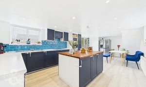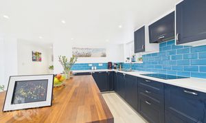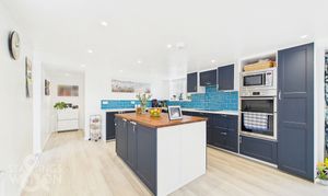 The main entrance opens into a spacious hall, where light walls and characterful tiled flooring provide access to both wings of the house. To the right, you'll find the expansive 25-foot open-plan kitchen and dining room. The kitchen boasts a generously proportioned island with base cabinets and a wood worktop. Surrounding the island, navy blue wall and floor cabinets offer ample storage, while white worktops provide plentiful preparation space, complemented by light blue tiled splashbacks. Integrated appliances, including an oven, microwave, hob, and extractor, enhance functionality. The adjacent dining area, bathed in natural light from bi-folding doors, leads to the garden and comfortably accommodates a large dining table.
