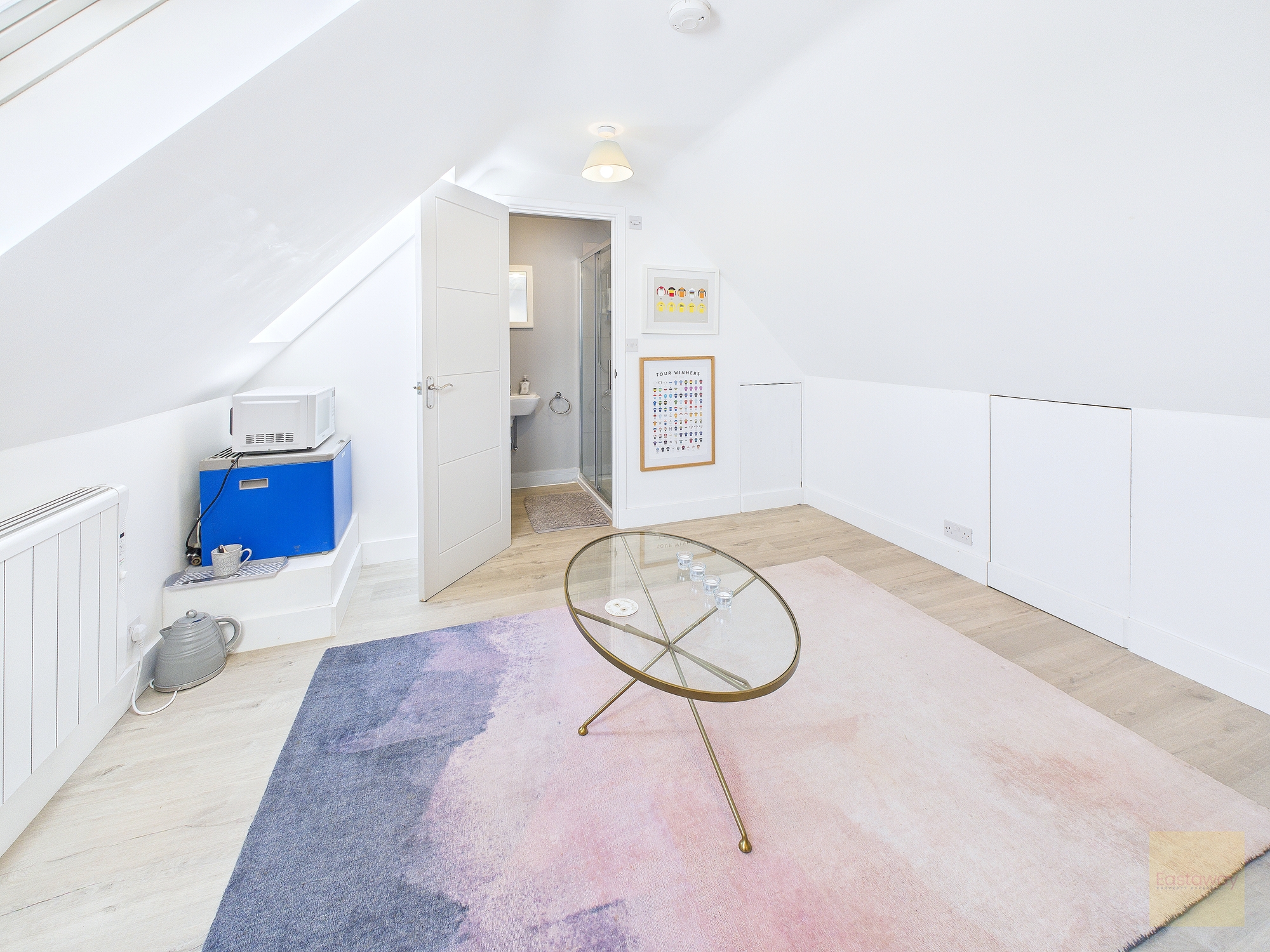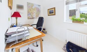 The double garage is more than just parking. Above it, there is a study with its own shower room. It has been used as a home office, but it could just as easily work as a guest space, a teenager’s retreat or even the beginnings of a self-contained annexe, subject to permissions.