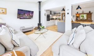 The kitchen, dining and living space is the heart of this home. It is light, open and designed for easy living. The central island makes a natural gathering point, the log burner brings warmth on winter evenings and the French doors open straight onto the garden in the summer. It is a space that feels social when you want it to be and calm when you just want to relax.