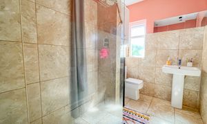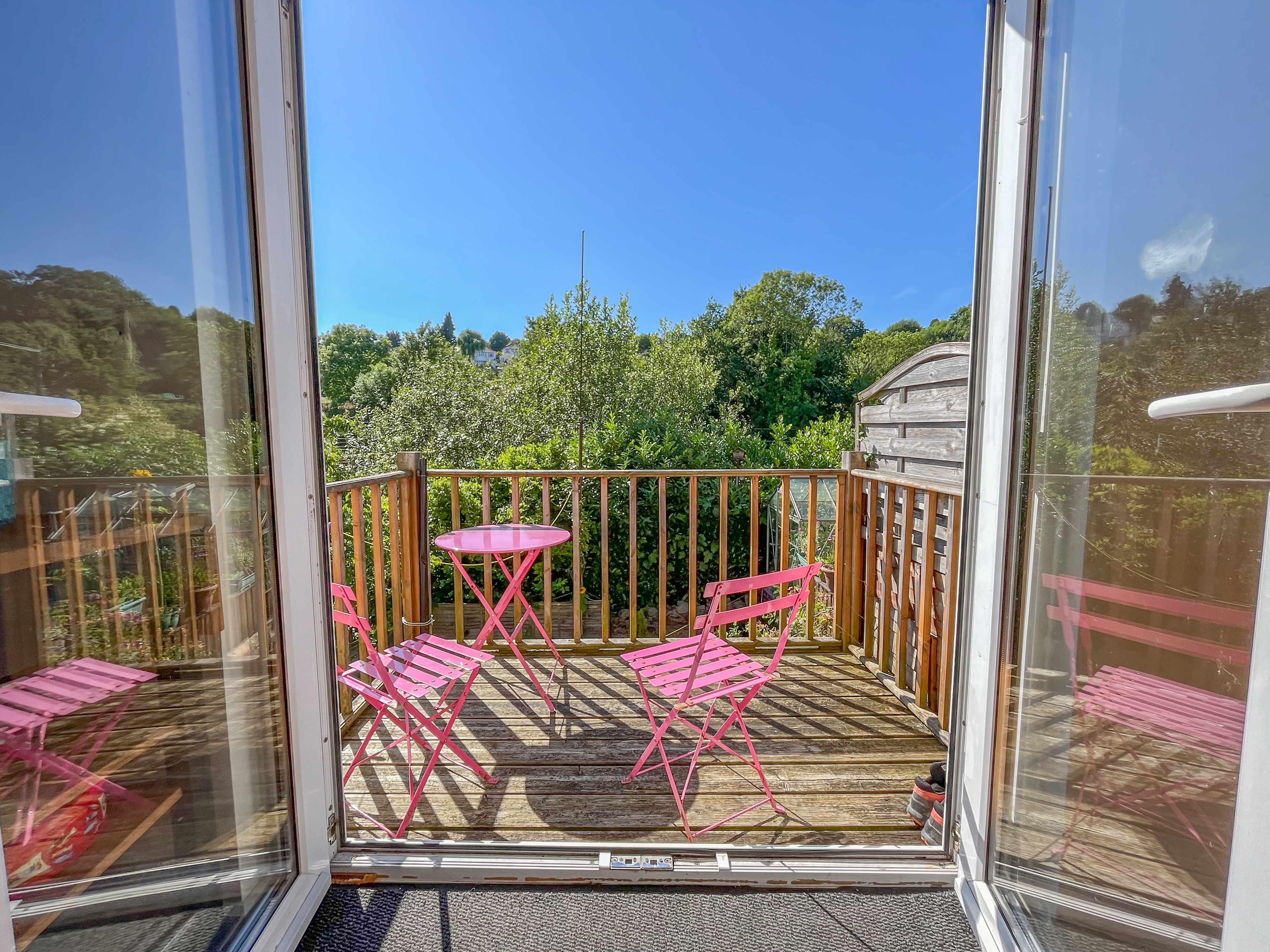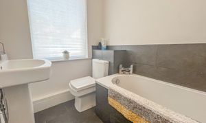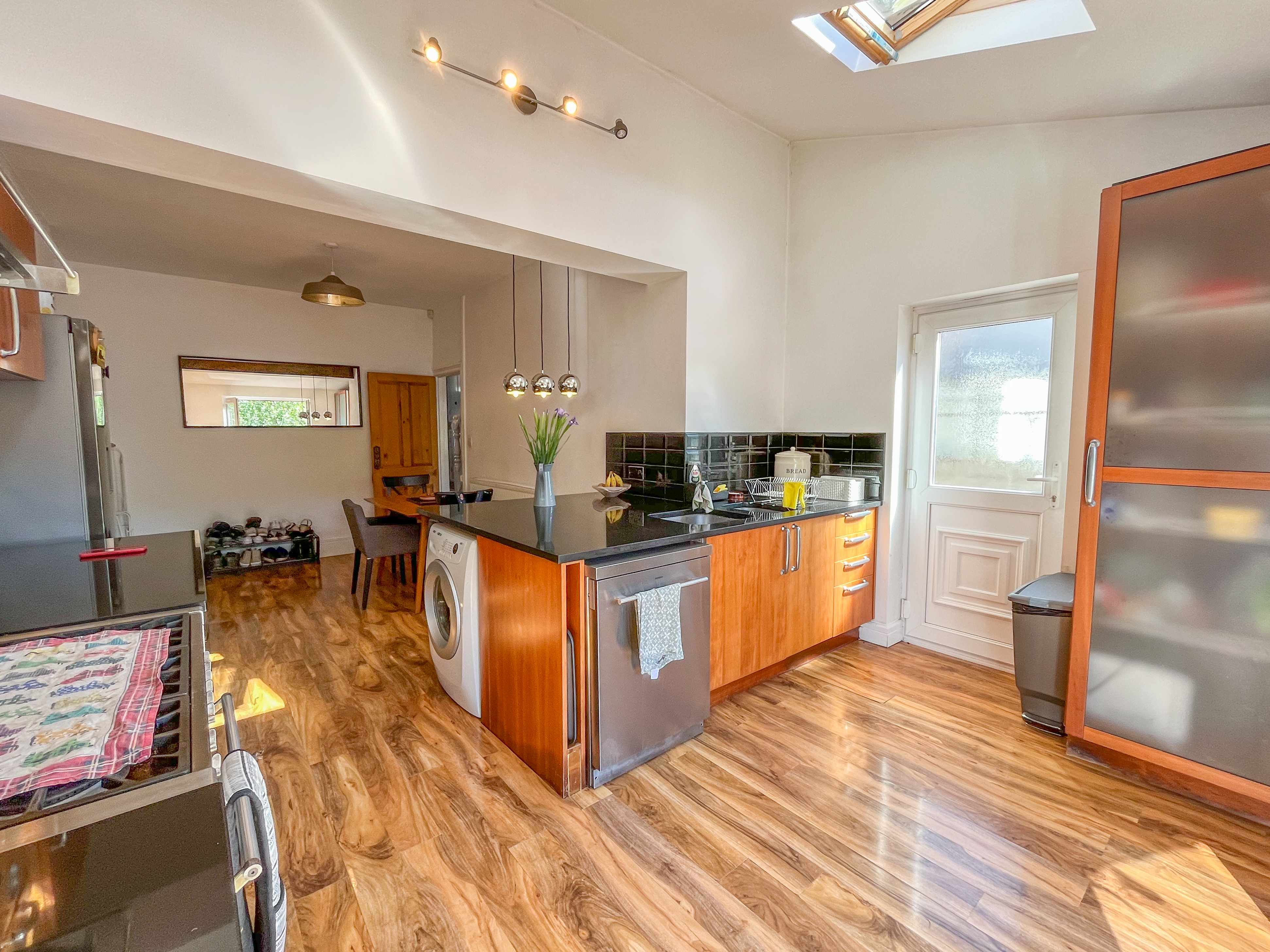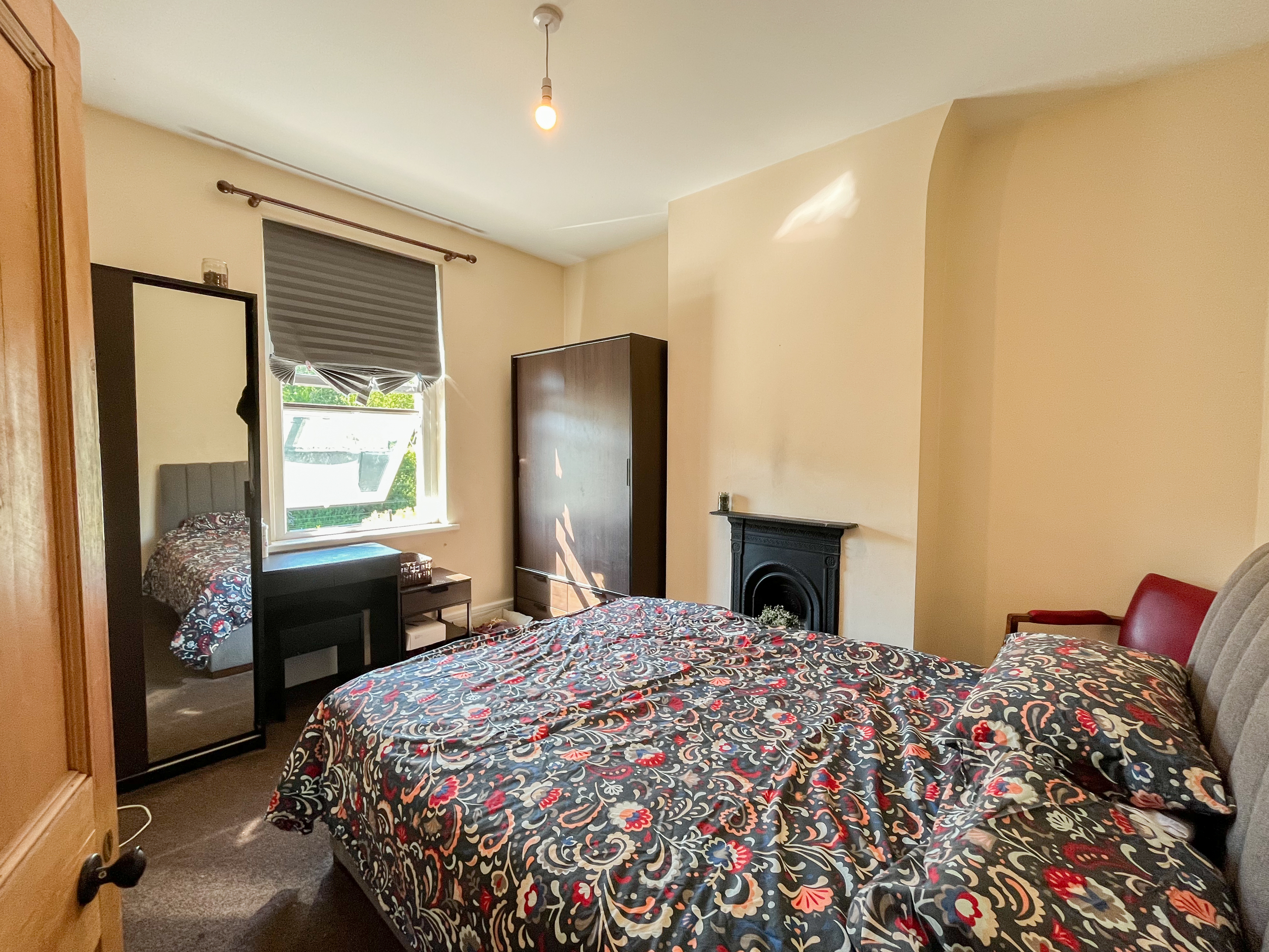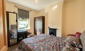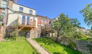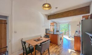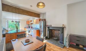 On the ground floor there is a bay-fronted living room and a spacious, open plan kitchen/diner to the rear. The contemporary kitchen is a fantastic entertaining space, with stylish base and wall units and integrated appliances to include an oven and fie-ring gas hob. Double doors from the kitchen open to a balcony, enjoying the lawned garden below. The property benefits from original features such as the ornate feature fireplace in the dining space and tiling to the hallway. There is a downstairs shower room with a walk-in shower and two storage cupboards beneath the stairs. On street parking is available to the front.