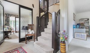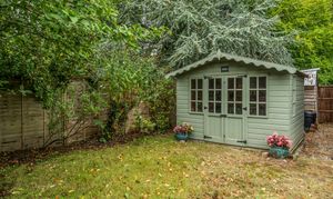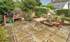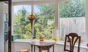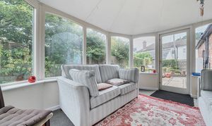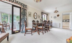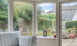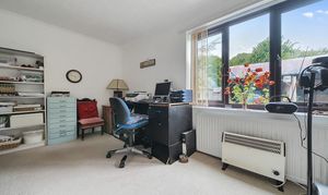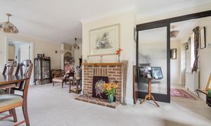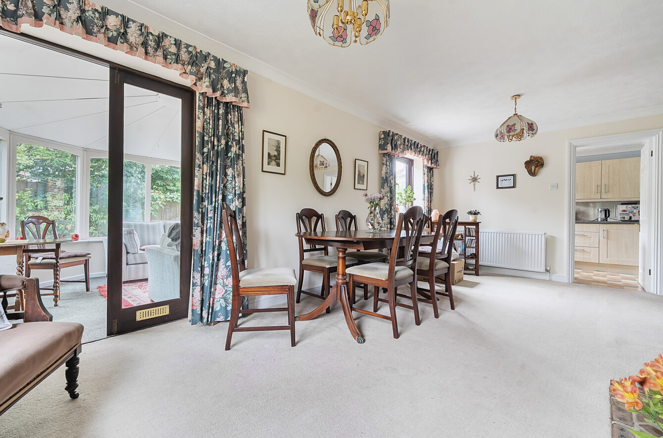 The front door opens into a bright hallway leading to a generous dining room with a feature fireplace. The galley-style kitchen provides plenty of cupboard space, and there’s a separate utility room for extra convenience. To the rear, a light and airy living room with dual aspect windows overlooks the garden, while the adjoining garden room is the perfect place to sit and enjoy the view. A newly refurbished shower room and a ground floor bedroom, currently used as a study, complete the downstairs layout.