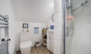 Upstairs, the first floor comprises a generously sized principal bedroom with extended layout and useful storage potential. A separate shower room serves the upper floor for added convenience.