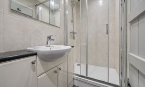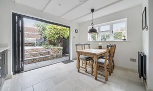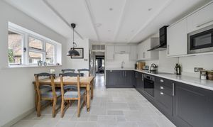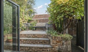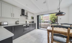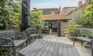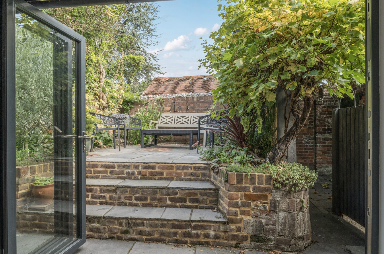 The front door opens into a welcoming reception room, where exposed timber beams and a captivating beehive fireplace create a warm and distinguished ambience. From here, a hallway leads past a cloakroom and a separate shower room to the generously proportioned kitchen. This space exudes a sleek, contemporary style, with bespoke cabinetry that harmoniously blends modern design with the home’s period character. Full-width bi-fold doors frame the view and open onto a private courtyard garden, where a raised terrace and a discreet storage shed add both charm and practicality.