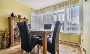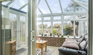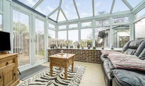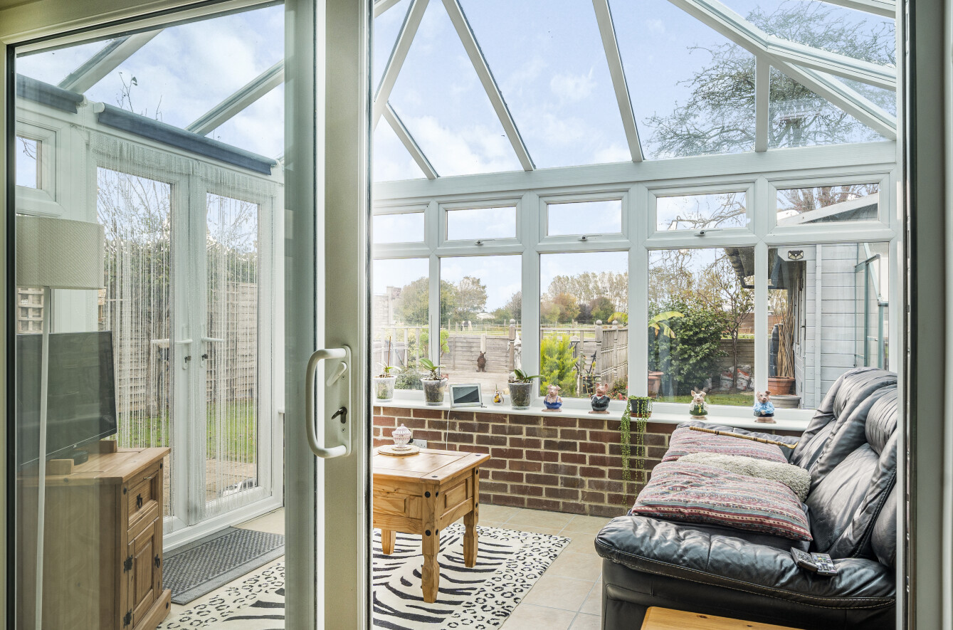 Measuring a generous 1,277 sq ft in total, the accommodation briefly comprises: enclosed entrance lobby with secondary front door opening into the sunny, south facing sitting-dining room. This room features a focal fireplace and delightful woodblock flooring which extends through the inner hall and into all three bedrooms. The kitchen is fitted with a range of white units providing ample storage along with an integral hob, oven and fridge-freezer, and spaces for both washing machine and dishwasher. From the inner hallway the modern shower room and all three bedrooms will be found. Bedrooms one and two are both double rooms with the second bedroom having a sliding door to the rear garden and the principal bedroom leading to the conservatory.