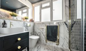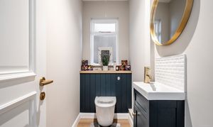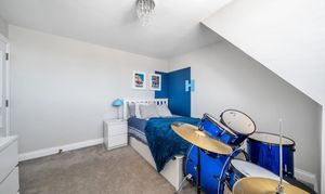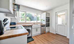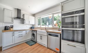 The modern kitchen is fully integrated with real oak worktops and features a double Butler sink, double oven and wooden floors. There is a large double cupboard containing the cylinder and doors to the covered porch which opens to the garage. Also on the ground floor is the large fourth bedroom with windows to the front of the house ensuring versatility and accessibility if required.