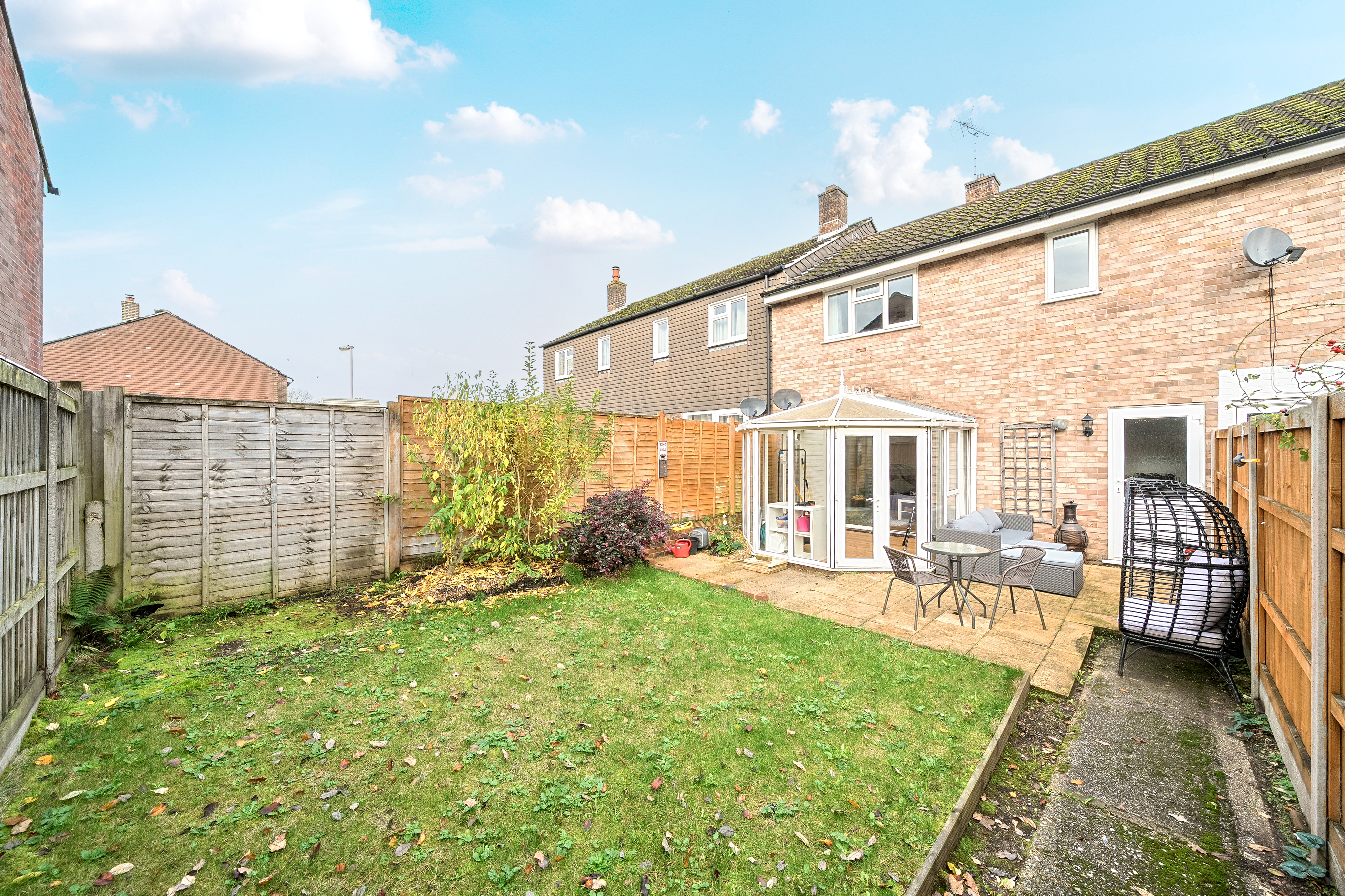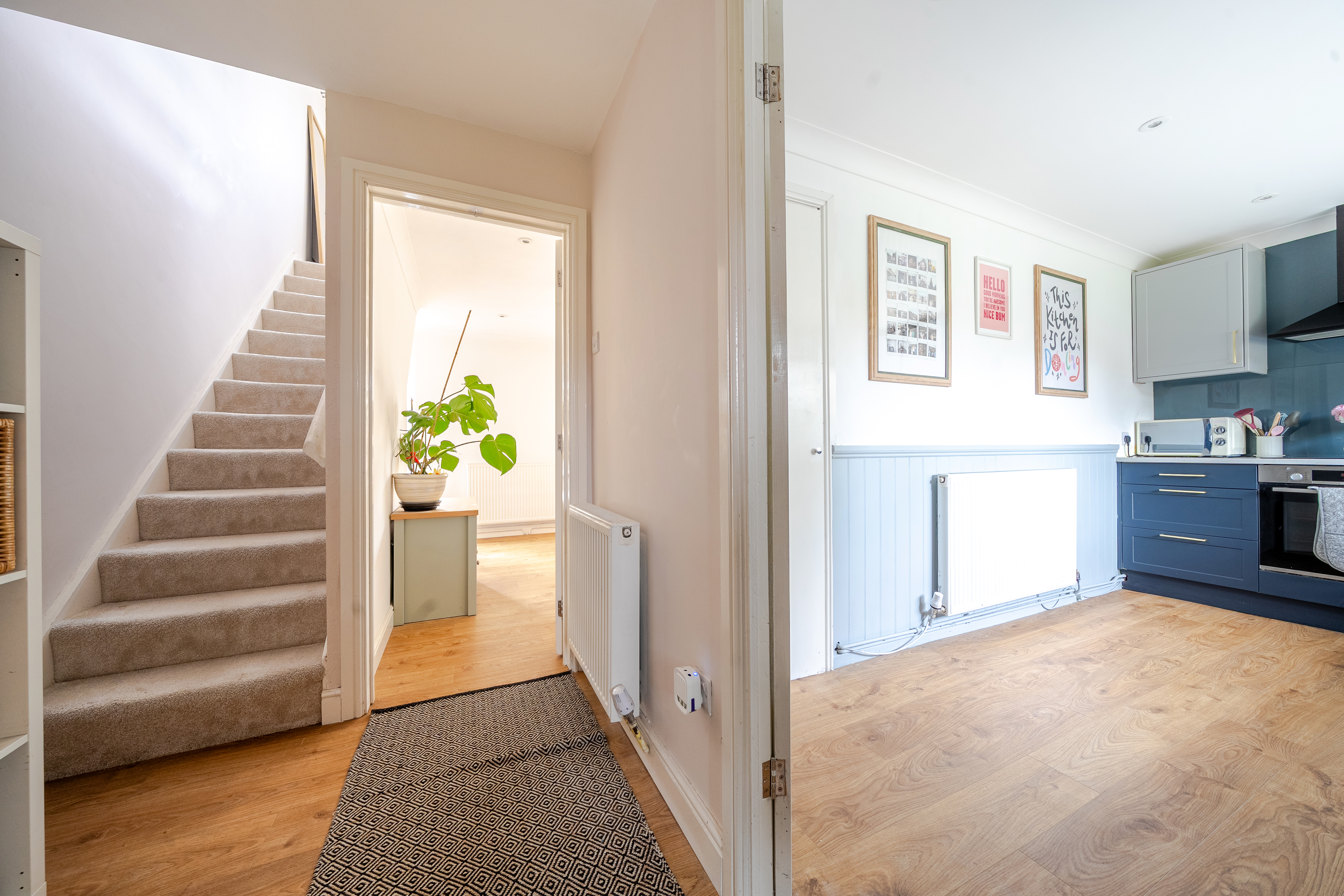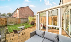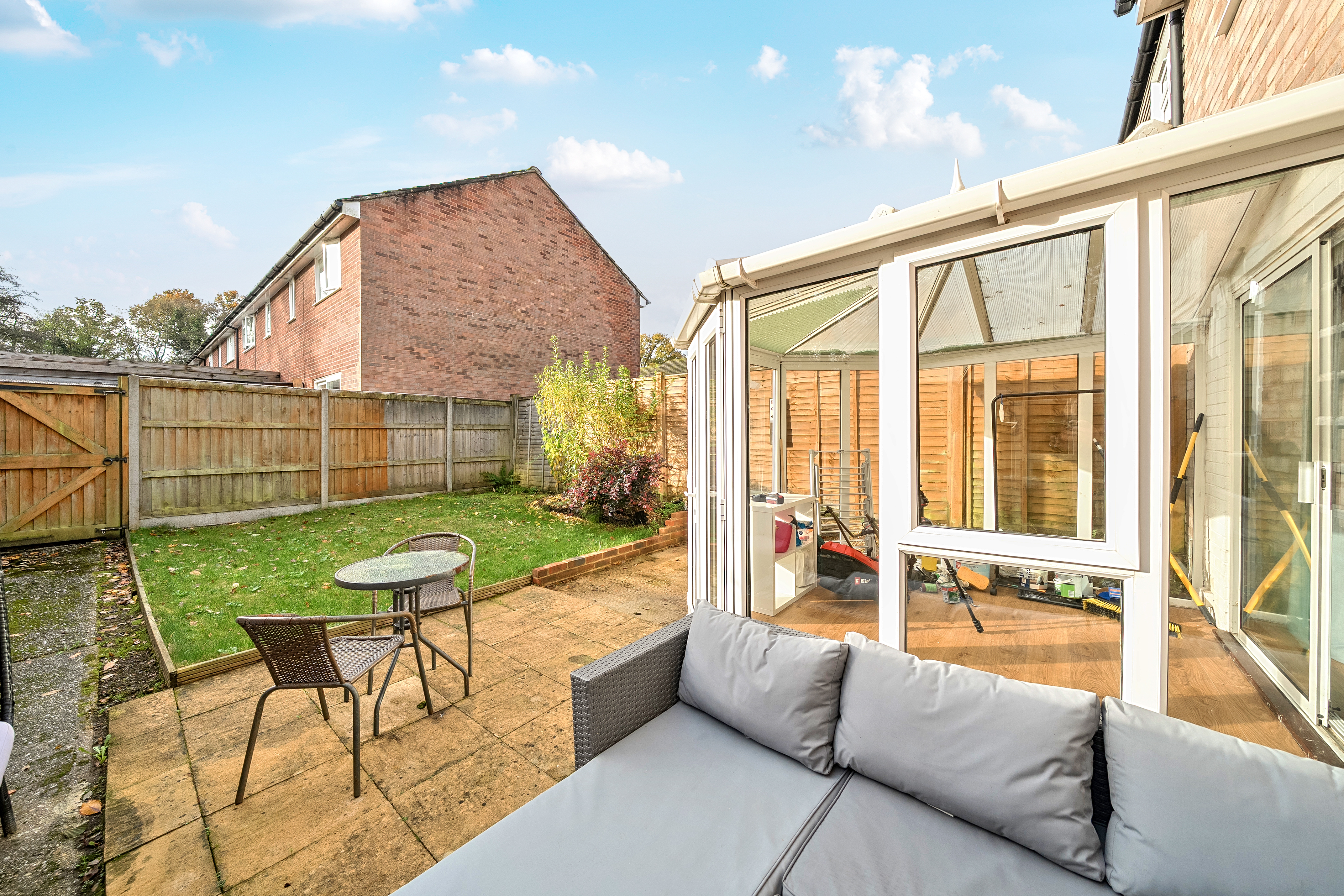 24 Mead Way is an ideal purchase for first-time buyers, having been tastefully refurbished to a high standard and offered ready to move straight into. The front of the property features a small paved patio, a covered porch over the entrance, and a pleasant outlook across a communal green. Inside, a beautifully fitted kitchen to the right boasts quartz worktops and integrated appliances including a washing machine, fridge/freezer and an oven with induction hob. A full-width sitting room runs along the rear of the house and provides direct access to a south-facing garden and a double-glazed conservatory, which floods the space with light. A convenient cloakroom completes the ground-floor accommodation.
