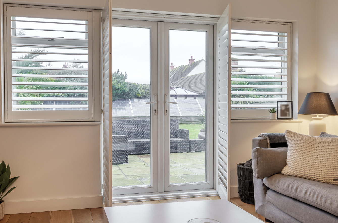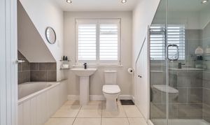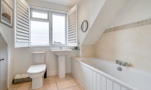 Ascending upstairs, you will find four spacious double bedrooms, each equipped with custom shutters, perfect for a family or regular guests. The principal bedroom benefits from an en-suite bathroom with a separate shower and bath, while a family bathroom, equipped with identical facilities, caters to the remaining bedrooms. Beautiful views over the sea can be enjoyed from the first-floor bathrooms, a standout feature of the property.