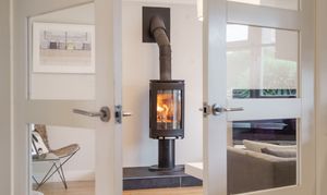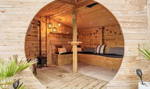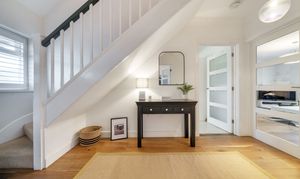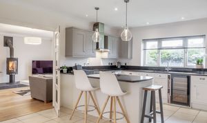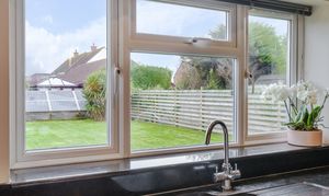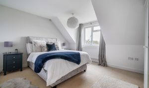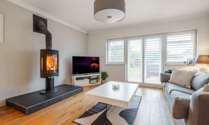 The outdoor space is thoughtfully designed, featuring south-facing solar panels for sustainability and energy efficiency. A low-maintenance garden with a lush lawn provides a great space for relaxing and enjoying the sea breeze. A bespoke cabin to the front of the property, houses an outdoor kitchen and log burner—an idyllic setting for summer cooking and cosy winter days. The property is further enhanced by a sizable frontage and off-road parking, capable of accommodating multiple vehicles.