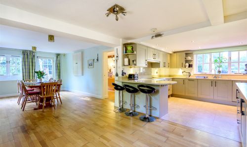 To the first floor, the main bedroom enjoys a double aspect and has fabulous views over the rear garden. There is ample fitted wardrobe space and a well equipped en-suite bathroom with a separate walk-in shower, a bath, wash hand basin and a low-level WC. At the opposing wing of the house is a further bedroom with a en-suite shower room and to complete the first floor are four further bedrooms, one of which has an en-suite, and a family bathroom.