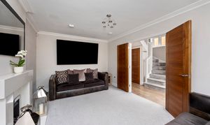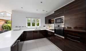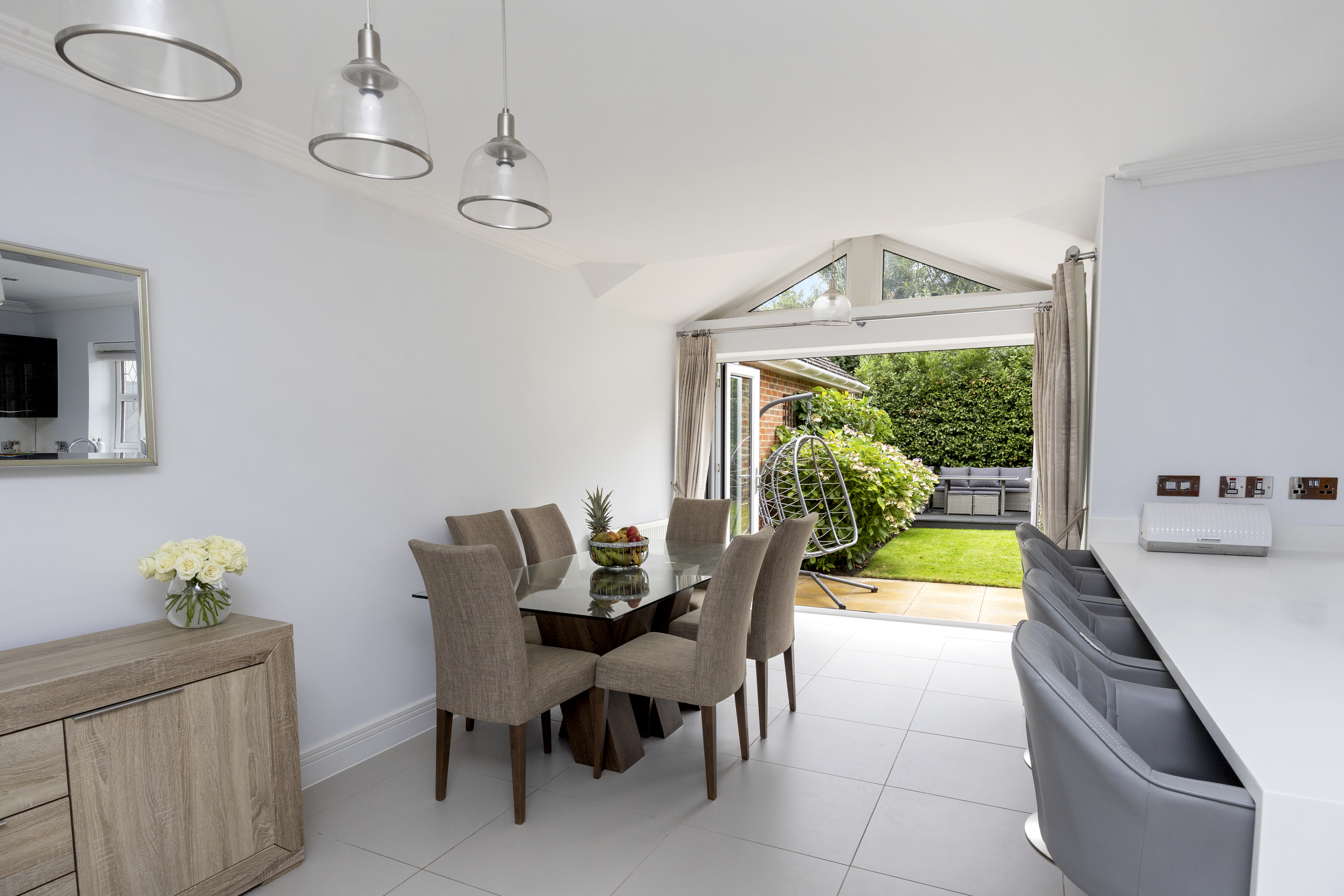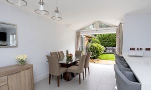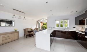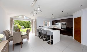 The reception hallway welcomes you and leads through to a stunning open plan kitchen/dining/family room. The kitchen has a superb specification with White Corian work surfaces and AEG appliances including; single oven and built in microwave, fridge/freezer, gas hob, Zanussi dishwasher and wine fridge. There is a sociable sit up breakfast bar, plus ample space for a dining table and bifold doors from the vaulted ceiling dining room area opening directly onto the rear garden terrace. There is underfloor heating throughout the kitchen and breakfast room. The separate sitting room enjoys views to the front of the property. Also of note to the ground floor is a separate utility room and cloakroom with Villeroy & Boch bathroom ware and quality chrome fittings.