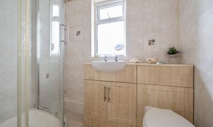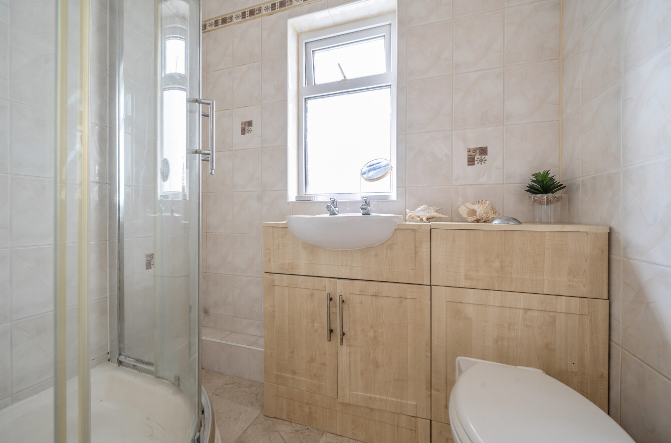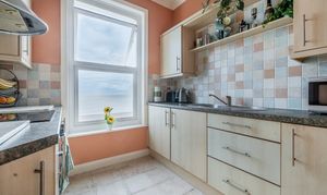 Both bedrooms are to the rear of the property, the first with a high ceiling with large windows and picture rail, the second with double casement window and picture rail. The kitchen consists of a range of wall base units, built-in cooker and hob extractor with direct sea views. The bathroom has a built-in corner shower cubicle and casement window.