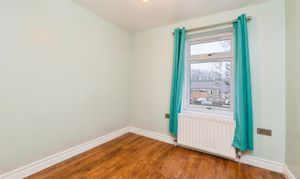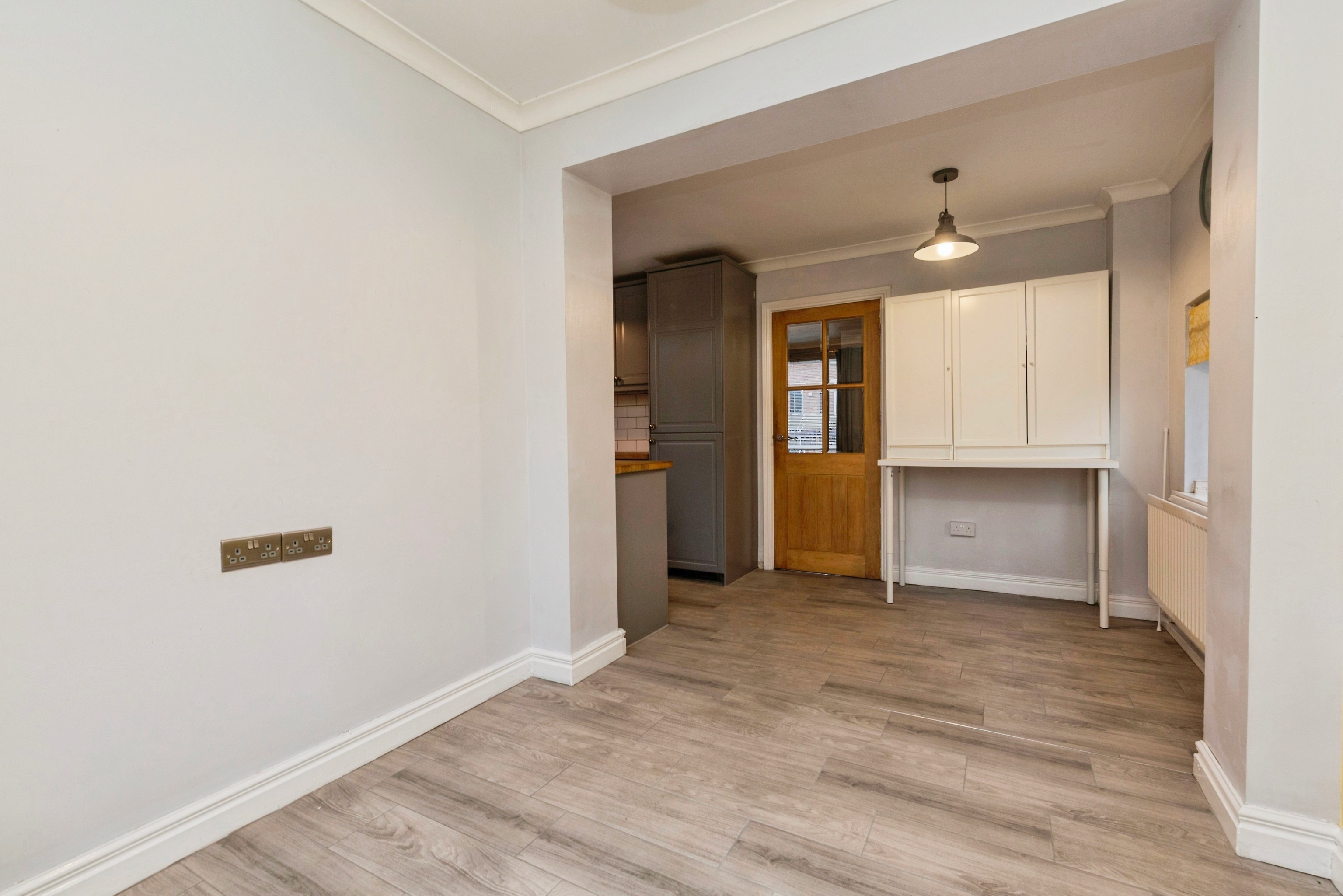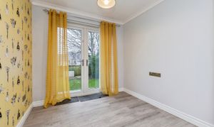 The property’s bathroom is finished to a high standard, featuring modern patterned tiles, a compact vanity unit, and a frosted window for privacy and natural light. Additional highlights include freshly painted neutral walls, contemporary lighting fixtures, and radiator heating to ensure year-round comfort. The layout flows naturally, with a combination of modern flooring and neutral colour palettes, making it easy for new owners to move in and make it their own. The presence of French doors, wooden doors with glass panels, and large feature windows throughout the home further enhance its bright and airy feel.