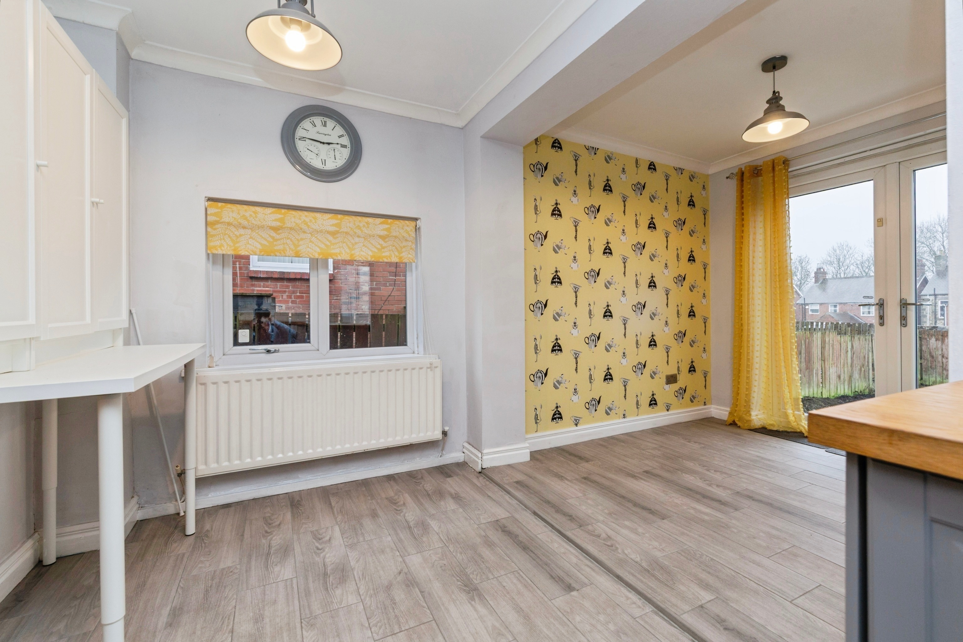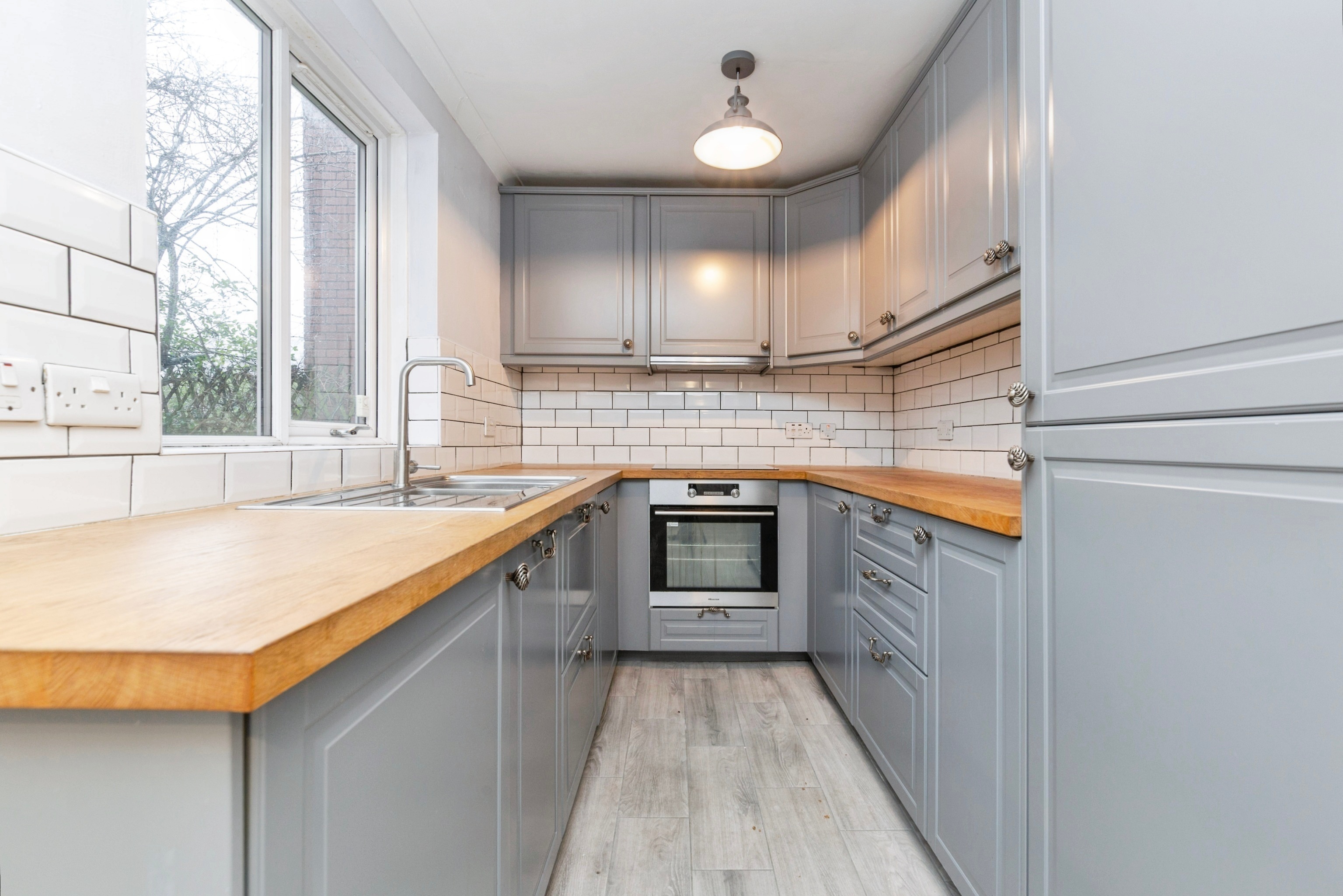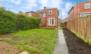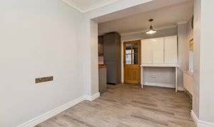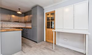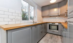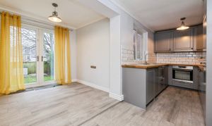 This beautifully presented three-bedroom semi-detached house offers an exceptional blend of modern living and family-friendly features. Upon arrival, the property impresses with its classic brick facade and a charming front garden, enclosed by a colourful picket fence and framed by double-glazed windows. Inside, two spacious reception rooms provide versatile living and entertaining options, each enhanced by large windows that flood the spaces with natural light. The open plan kitchen and dining area is a particular highlight, featuring sleek grey cabinetry, warm wooden countertops, and a stylish white subway tile backsplash. Integrated appliances, including a modern oven, create a seamless cooking experience, while the elegant wooden and tiled flooring throughout adds a touch of sophistication. French doors from the kitchen and living areas open directly onto a generous garden, seamlessly connecting indoor and outdoor spaces and inviting an abundance of light into the heart of the home.