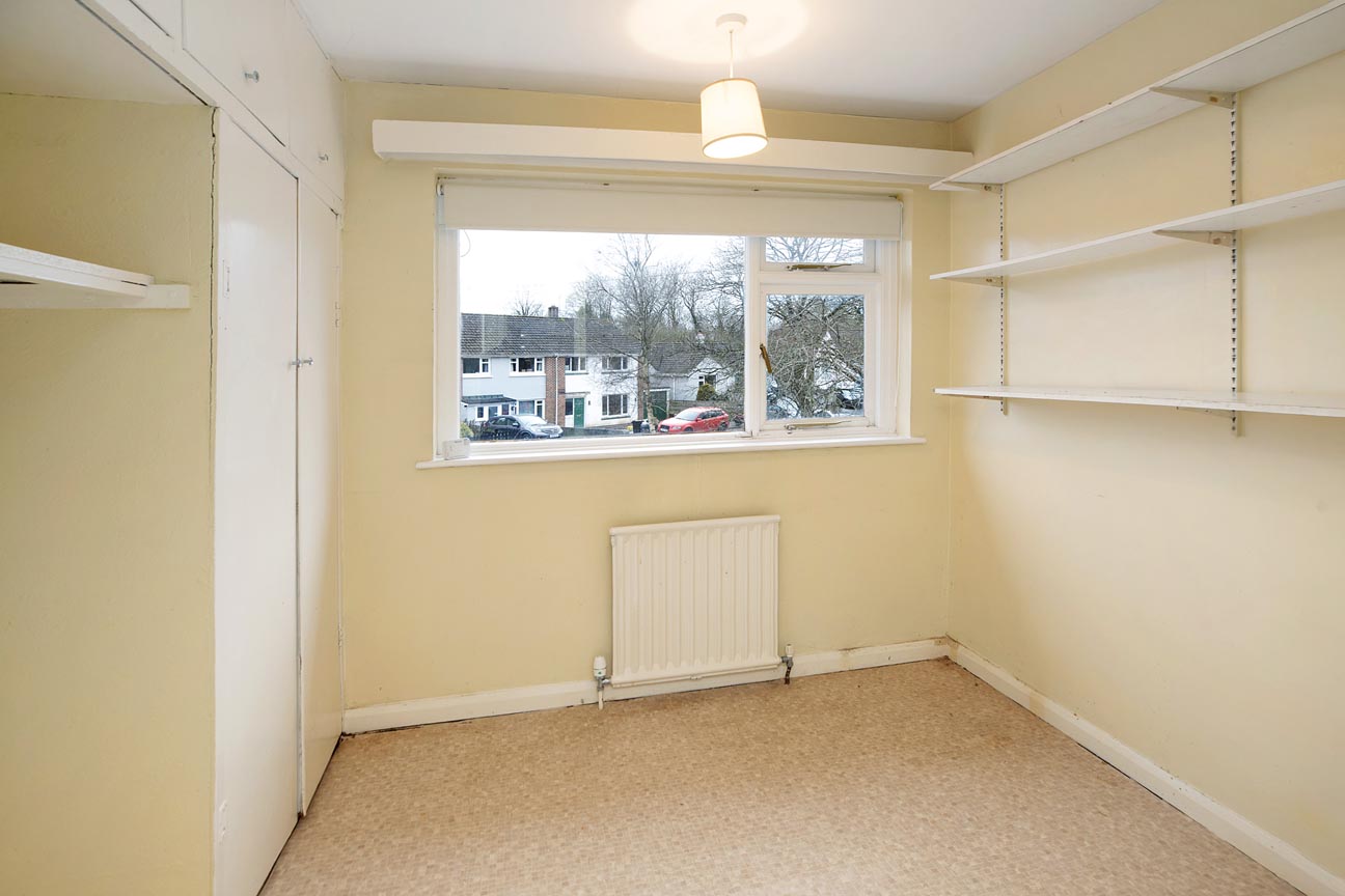 Upstairs, the first-floor landing leads to all bedrooms and the shower room. The shower room is positioned to the left and is fitted with a shower cubicle, wash basin, and WC. Bedroom two is a well-proportioned double bedroom overlooking the rear garden and benefits from built-in shelving across the back wall. The main bedroom is another generous double, positioned at the front of the property. Bedroom three, currently used as a home office, is a good-sized single bedroom featuring a front-facing window and built-in cupboards along one wall.
