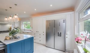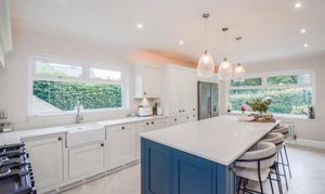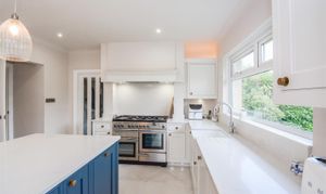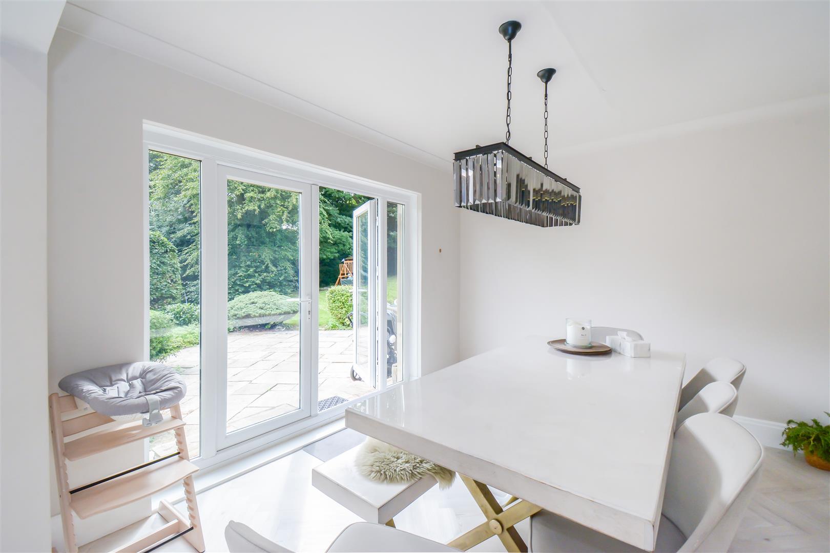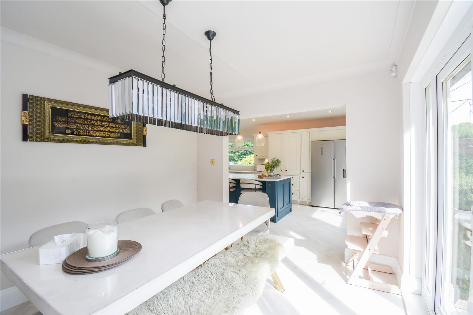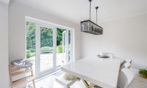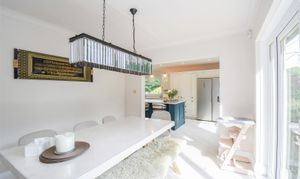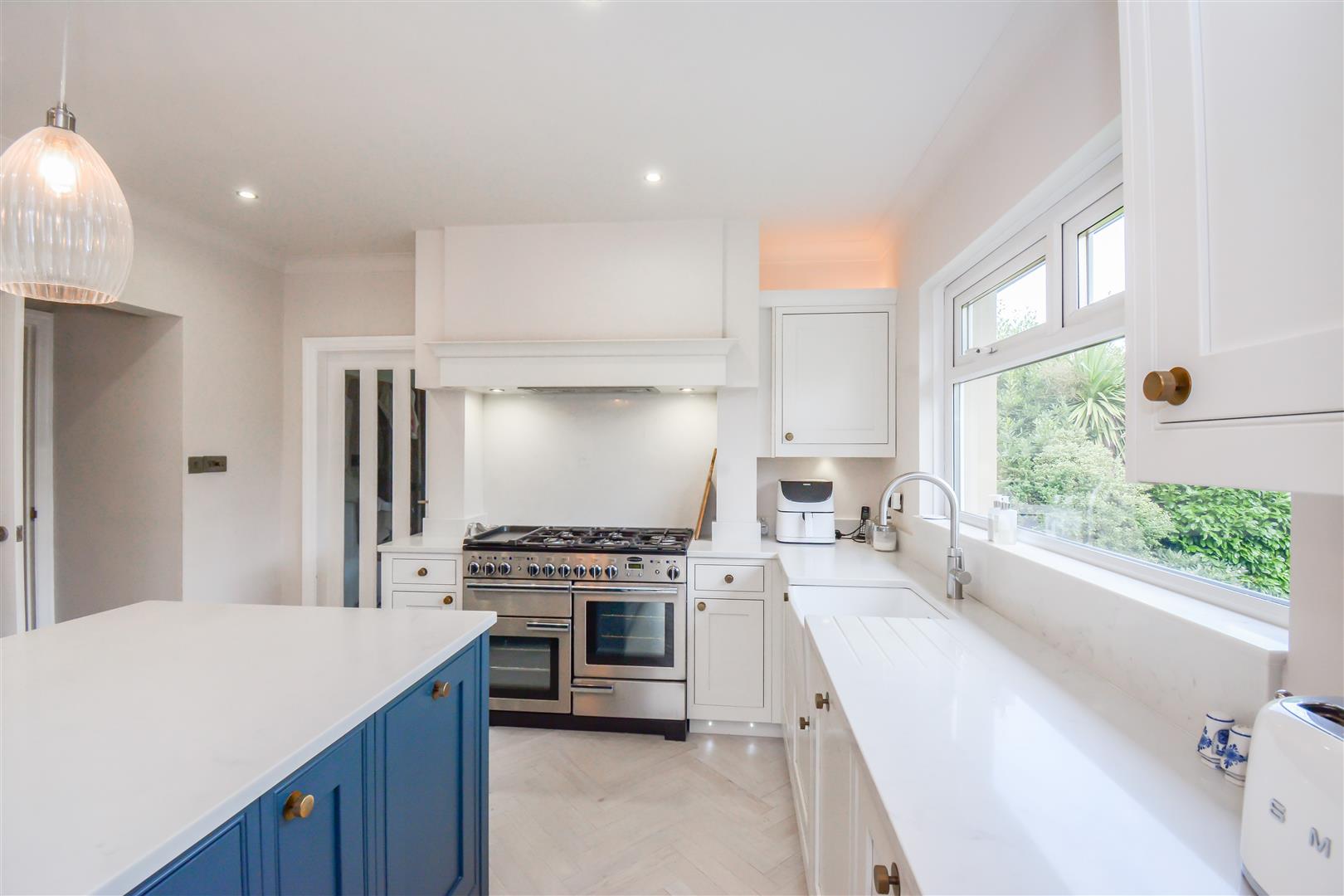 Dimensions: 6.15m x 3.66m (20'2 x 12'0). With a dual aspect PVCu double glazed windows providing this area with an abundance of natural light, the kitchen was re-fitted in circa 2021 and has a herringbone LTV flooring which continues through into the dining room. There are a generous range of base and wall cupboards with porcelain and contrasting ‘Hague Blue’ units these are complimented by brass handles with contrasting overlying quartz worktops, there is an inset Caple Belfast sink with Quooker brushed stainless steel monobloc tap over which also provides boiling water, housed within the chimney breast is a rangemaster dual fuel cooker with five burner gas hob, hotplate, electric double oven and grill and warming drawer (this is available by separate negotiations at a price to be agreed) with extractor hood and downlighters over, there is an integrated Neff dishwasher, housing for fridge freezer which currently has a Samsung fridge and Samsung freezer with water dispenser, larder cupboard with integrated stainless steel microwave, LED strip lighting and storage shelves, the island unit has an over lying quartz worktop which extends to form a breakfast bar with drawers, cupboards, wine cooler and integrated bin beneath. There is a column style radiator, inset LED downlighters and three ceiling light points above the island unit on a dimmer switch and further LED lighting above and below the wall cupboards and low level LED lighting. Open plan to the kitchen is the dining room.