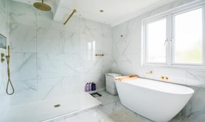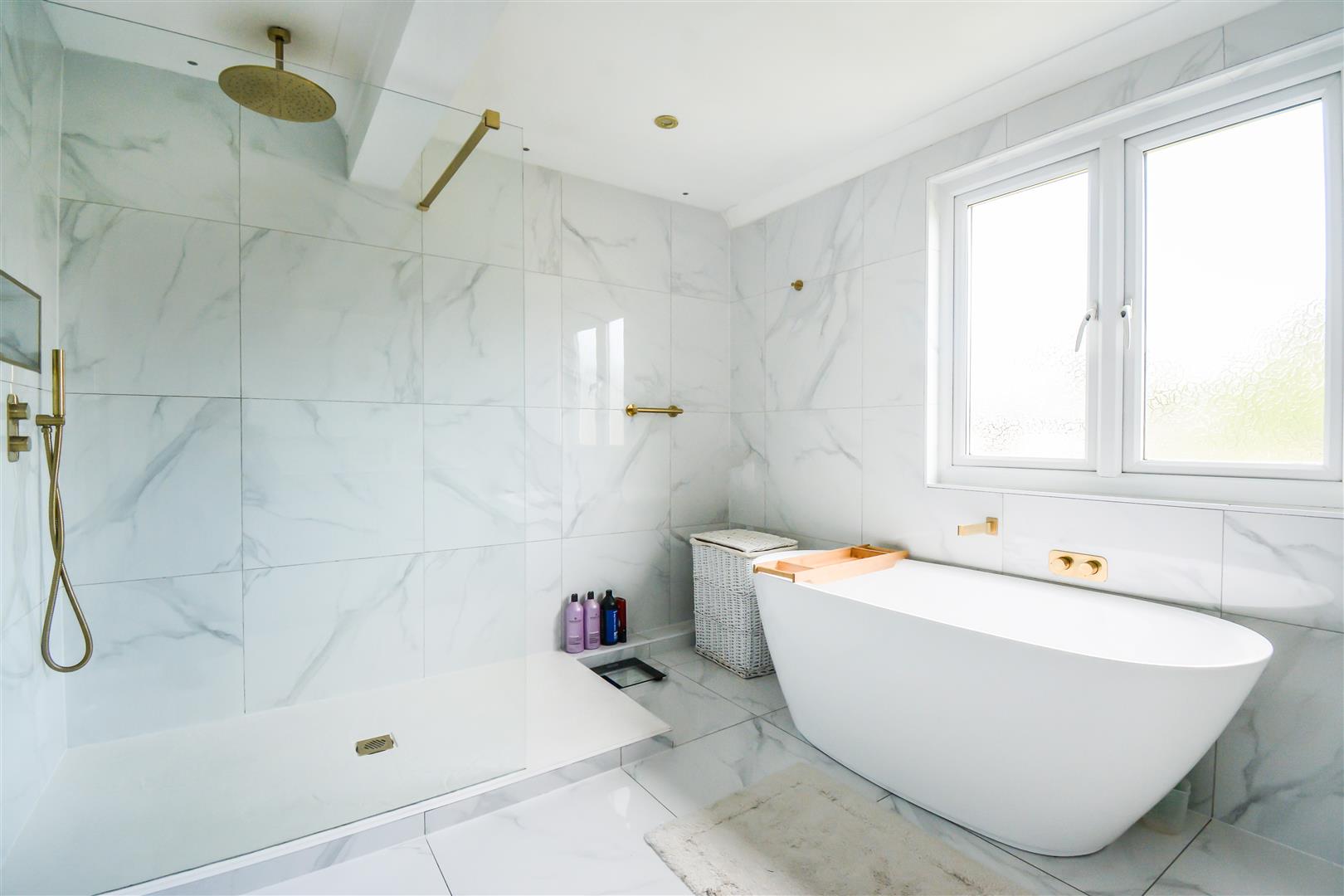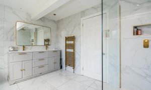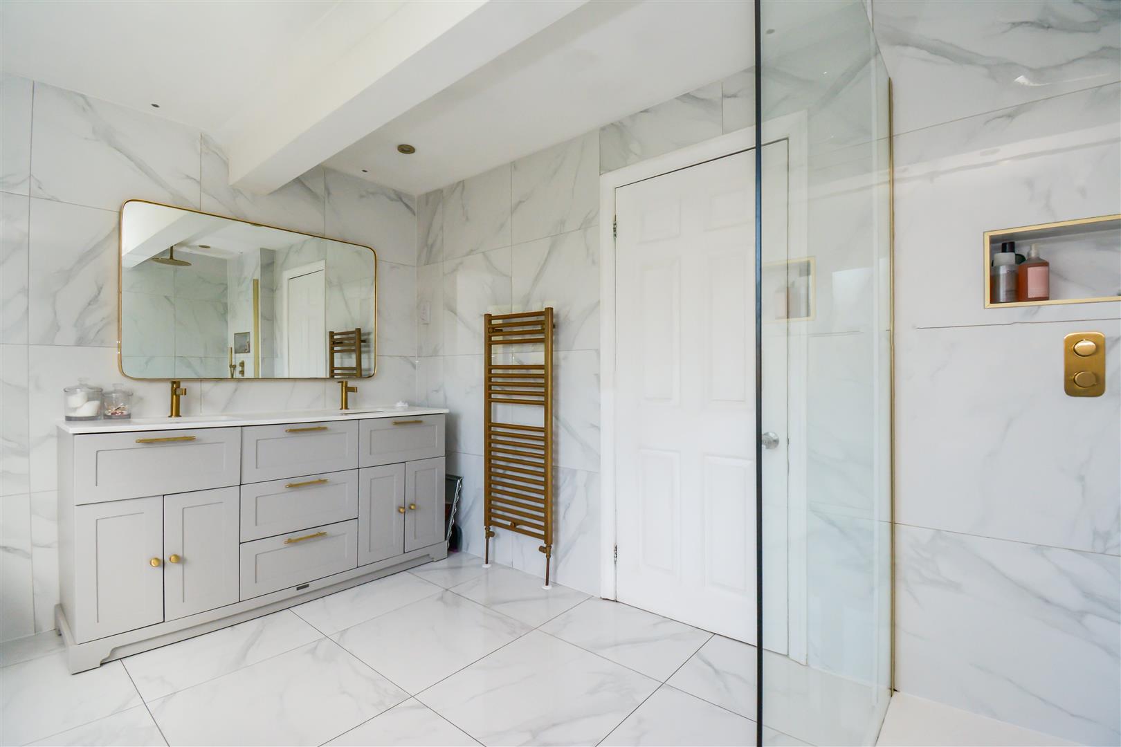 Dimensions: 3.53m x 2.79m (11'7 x 9'2). With a frosted double-glazed window, inset ceiling downlighters, floor to ceiling tiled walls, tiled floor, there is a shaver socket, antique brass ladder style heated towel rail, there is a vanity unit with cupboards and drawers together with overlying twin Vitra wash basins each having an antique brass monobloc tap, free standing bath with antique brass wall mounted mixer tap, Japanese style w.c. and large walk-in shower with glazed side panel and antique brass ceiling rose and separate hand spray.