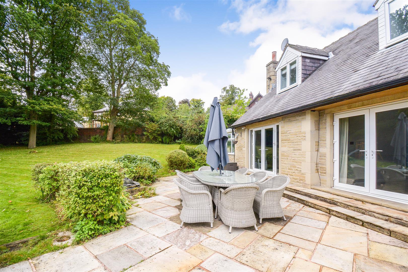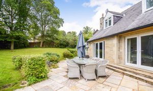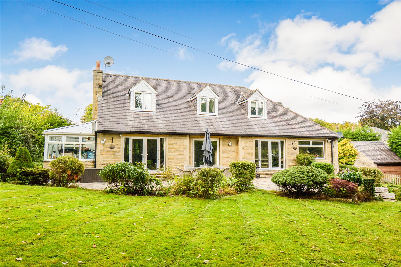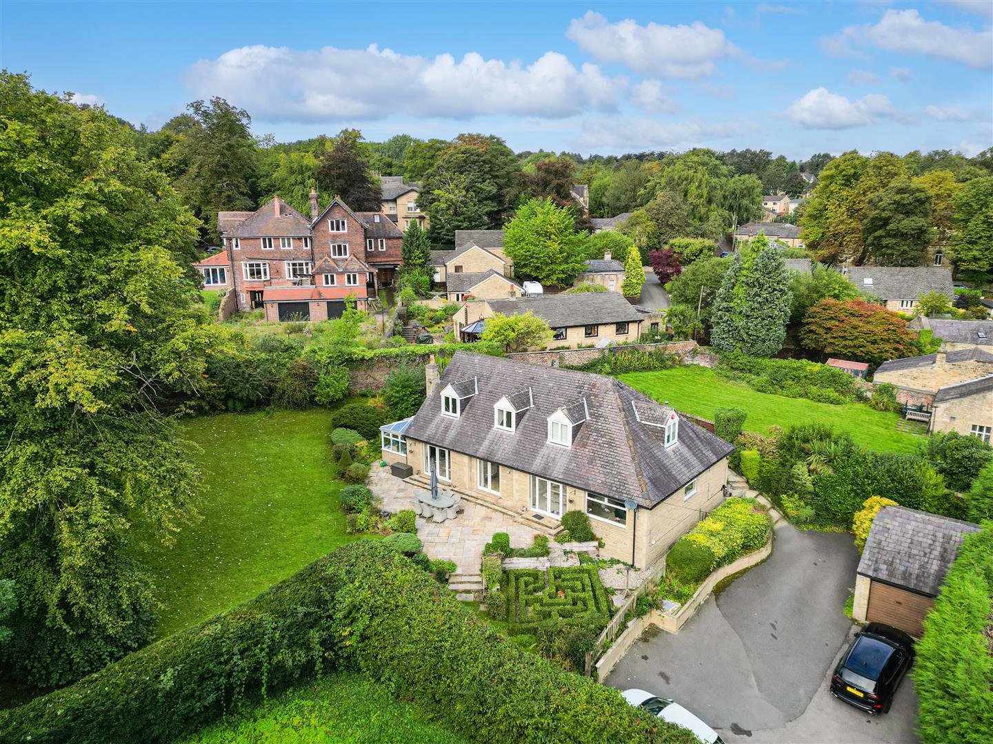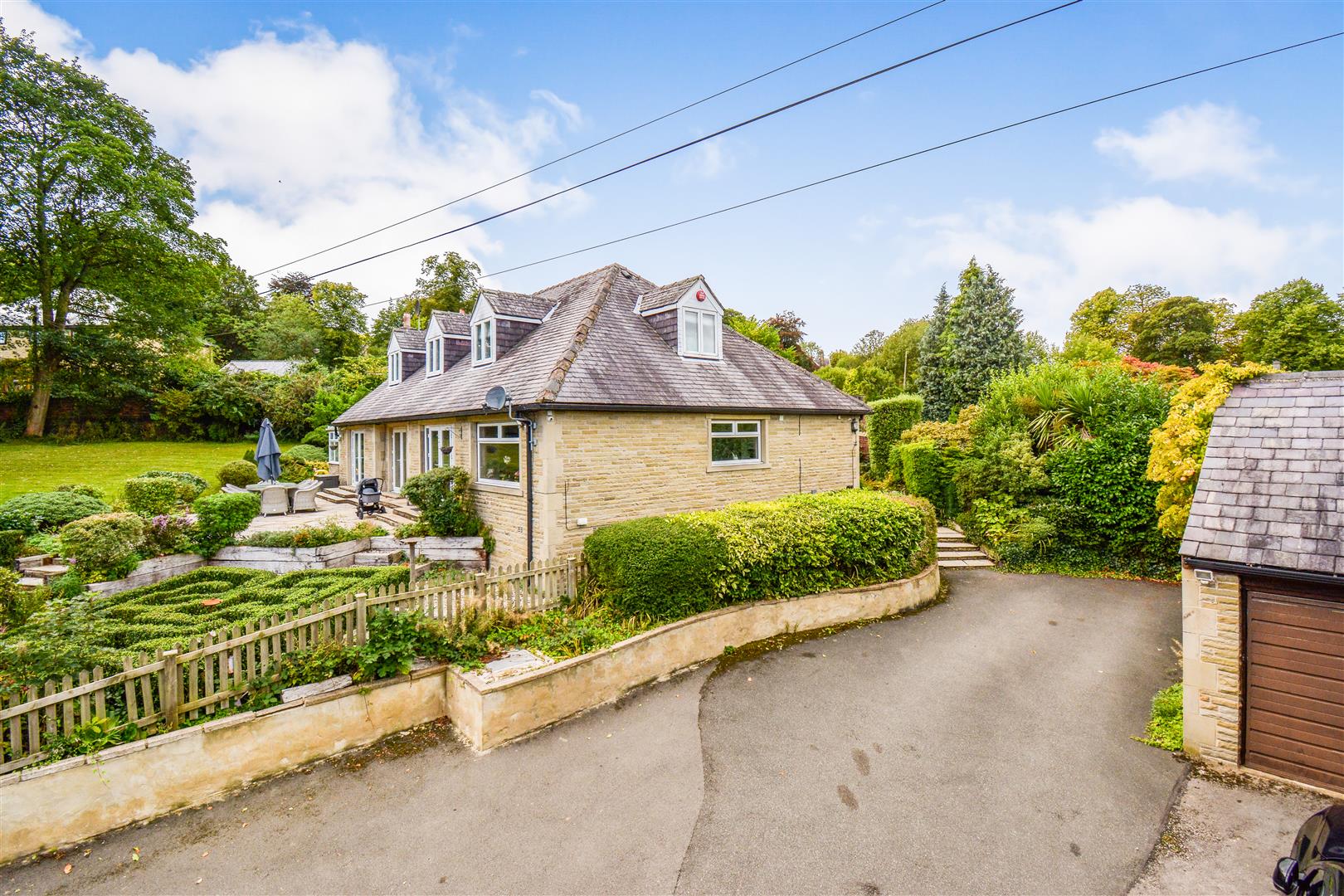 The property is situated to the rear of Cote Royd House with two large stone gate posts with a tarmac driveway leading to a parking area for several vehicles and in turn leading to a detached stone built and slated garage. The garage measures 18’2 x 15’8 with timber and frosted glazed windows to the side elevations, there is roof void storage, power, light and an up and over door. Immediately to the rear of the garage there is an attached timber store. To the rear of the property there is a stone flagged patio, outside cold-water tap, planted trees and shrubs, crushed blue slate, and bordered by a brick and stone wall giving privacy. To the far side of the house there is a private patio area together with crushed blue slate and a flagged pathway leading down the side of the garden room where there is a further outside cold water tap and leading to a stunning rear garden which once again is walled to one side and this area is a lovely space for children and for entertaining and is very well screened offering a high degree of privacy and having a number of mature trees, planted shrubs large lawned garden, children’s play area and immediately to the rear of the property there is a stone sun terrace which enjoys a southerly aspect, there is also a small hedge shaped into a maze and just below this a five bar gate provides access to the driveway.