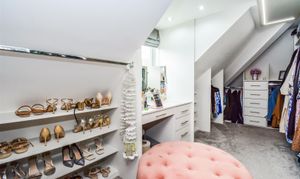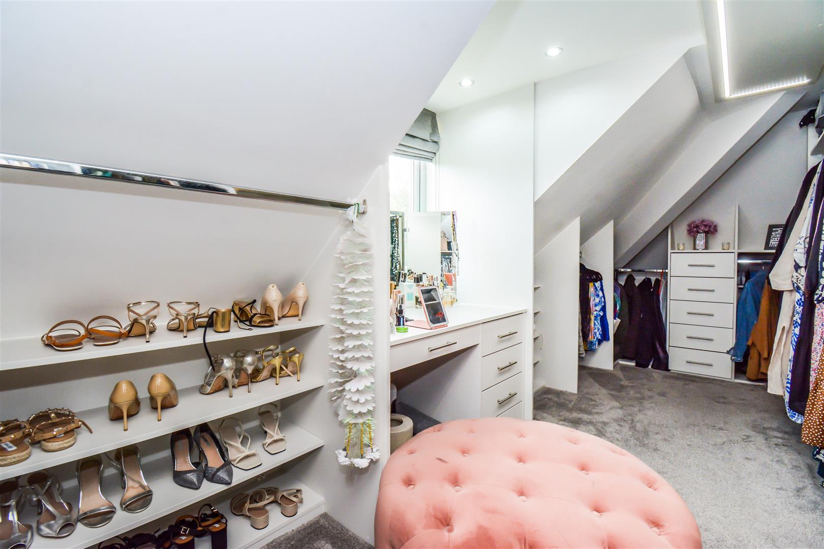 Dimensions: 5.54m x 2.64m (18'2 x 8'8). This has a number of storage areas with cloaks hanging rails, shoe storage, drawers, dressing table with drawers beneath, PVCu double glazed window, inset LED downlighters and LED strip lighting