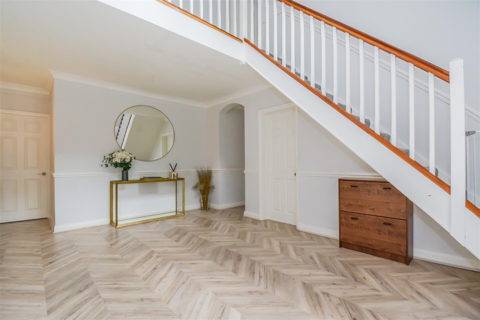Twin PVCu double glazed French doors open into the reception Hall. This measures 18’7 x 11’7 as the dimensions indicate this is a spacious and welcoming area which has a galleried landing, there is a further window above the French doors which fills this whole area with natural light, there is a ceiling light point, wall light point, ceiling coving, dado rail and oak effect chevron style laminate flooring. From the reception hall access can be gained to the following:-