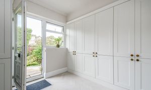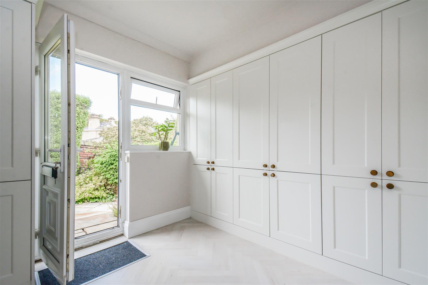 Dimensions: 2.74m x 2.82m (9'0 x 9'3). This is situated to the rear of the kitchen and has a continuation of the LVT herringbone flooring. There is a PVCu double glazed window and adjacent door giving access to the rear of the property, there are inset LED downlighters, ceiling coving, column style central heating radiator, cupboard housing a Vaillant gas fired central heating boiler and a further bank of cupboards with shelving together with an inset single drainer stainless steel sink with chrome monobloc tap and with space for both washing machine and tumble dryer.