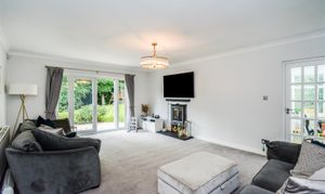 Dimensions: 3.45m x 3.10m (11'4 x 10'2). With a continuation of the LVT herringbone flooring, there is a ceiling light point, ceiling coving and PVCu double glazed windows with French doors opening out on to the garden.