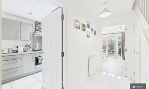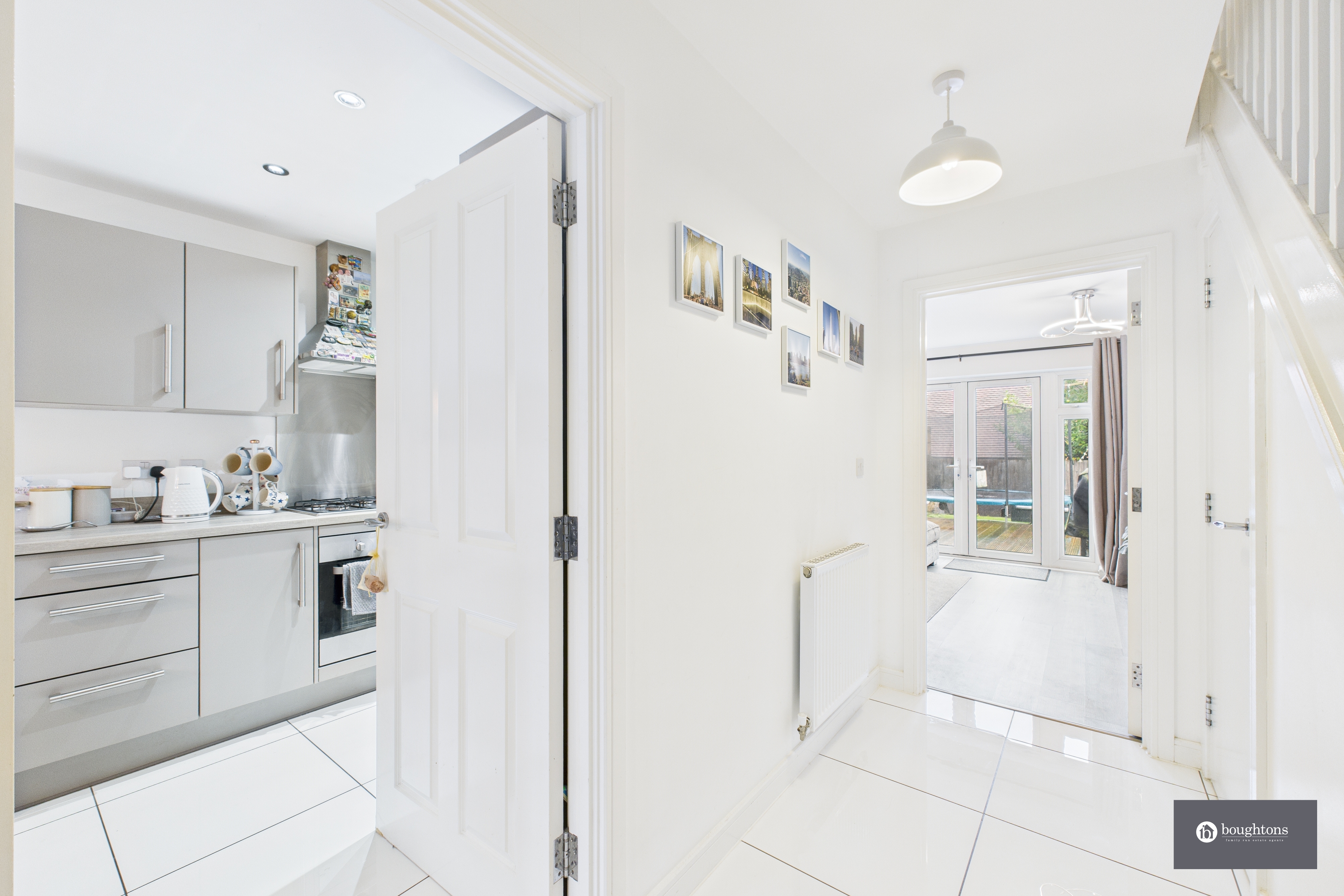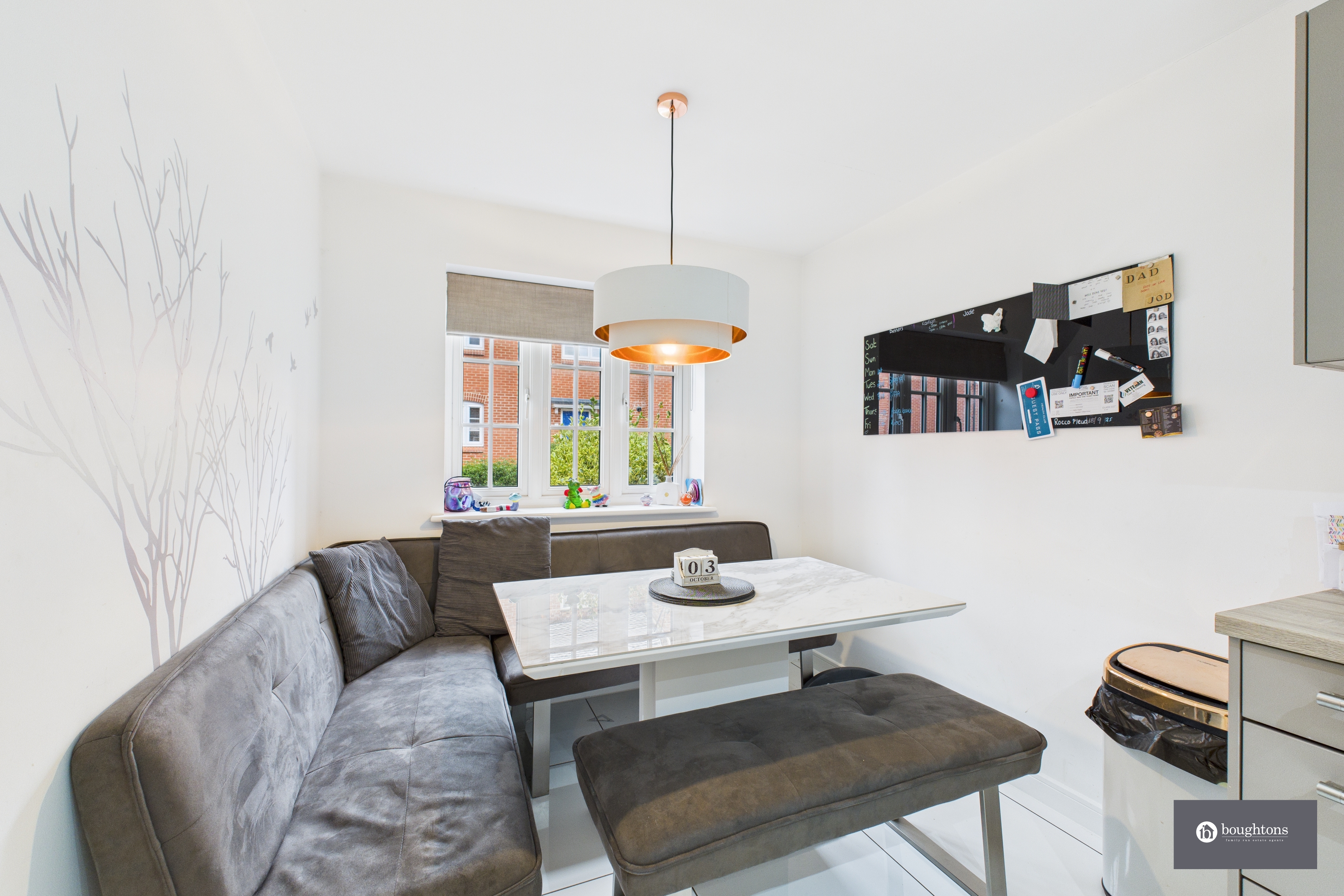 The tiled entrance hall leads to a convenient downstairs W.C. and a contemporary kitchen-diner, complete with tiled flooring, a built-in oven and extractor fan, and a range of sleek wall and base units providing excellent storage. With plenty of room for a dining table, it’s an ideal spot for family meals or relaxed entertaining.